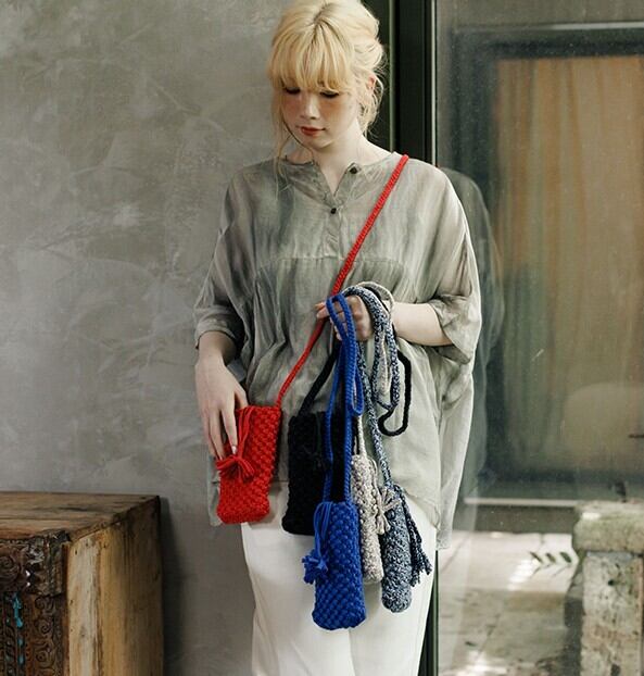 糸を結びながら編み込む「マクラメ編み」でハンドメイドされたボトルバッグは、しっかしとした作り。斜め掛けにして、ボトルやスマートフォンなどがちょうど良く入る大きさです。色違いでそろえたくなる、アクセサリーアイテムです。「PROJECT1000」オリジナルの保存袋に入れてお届けします。