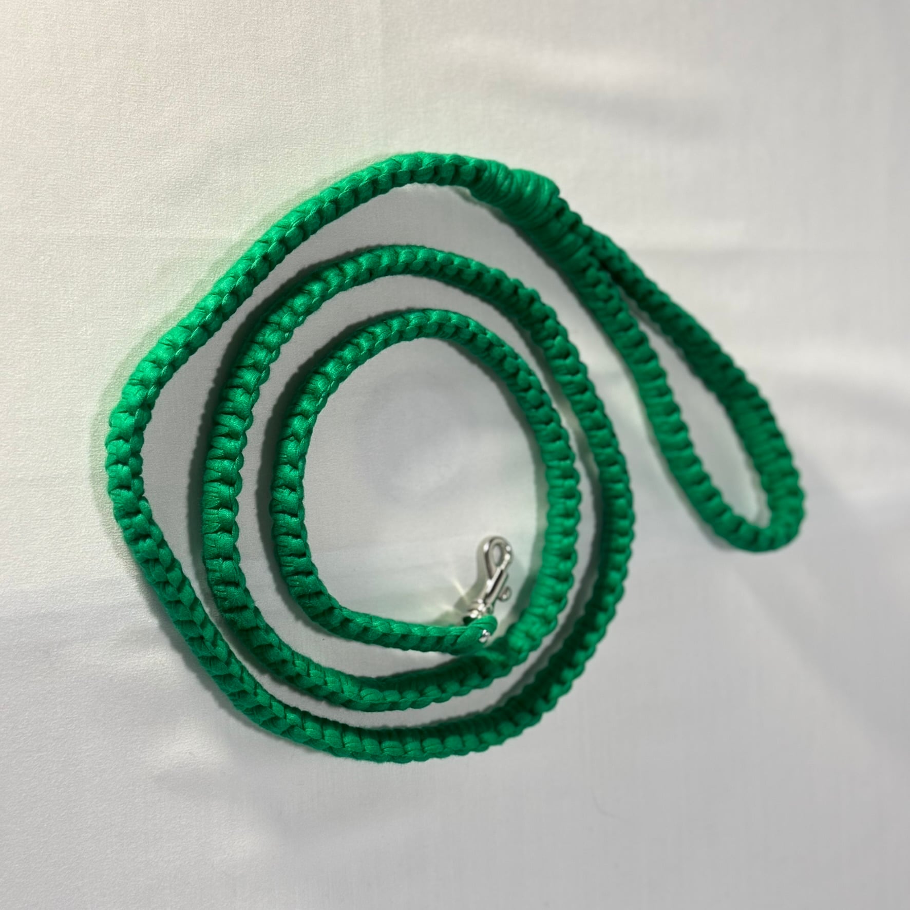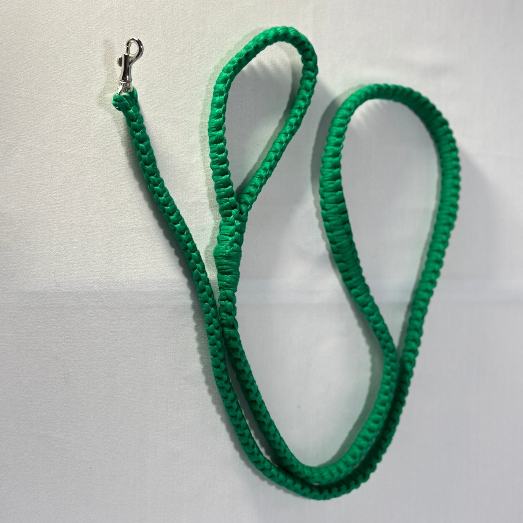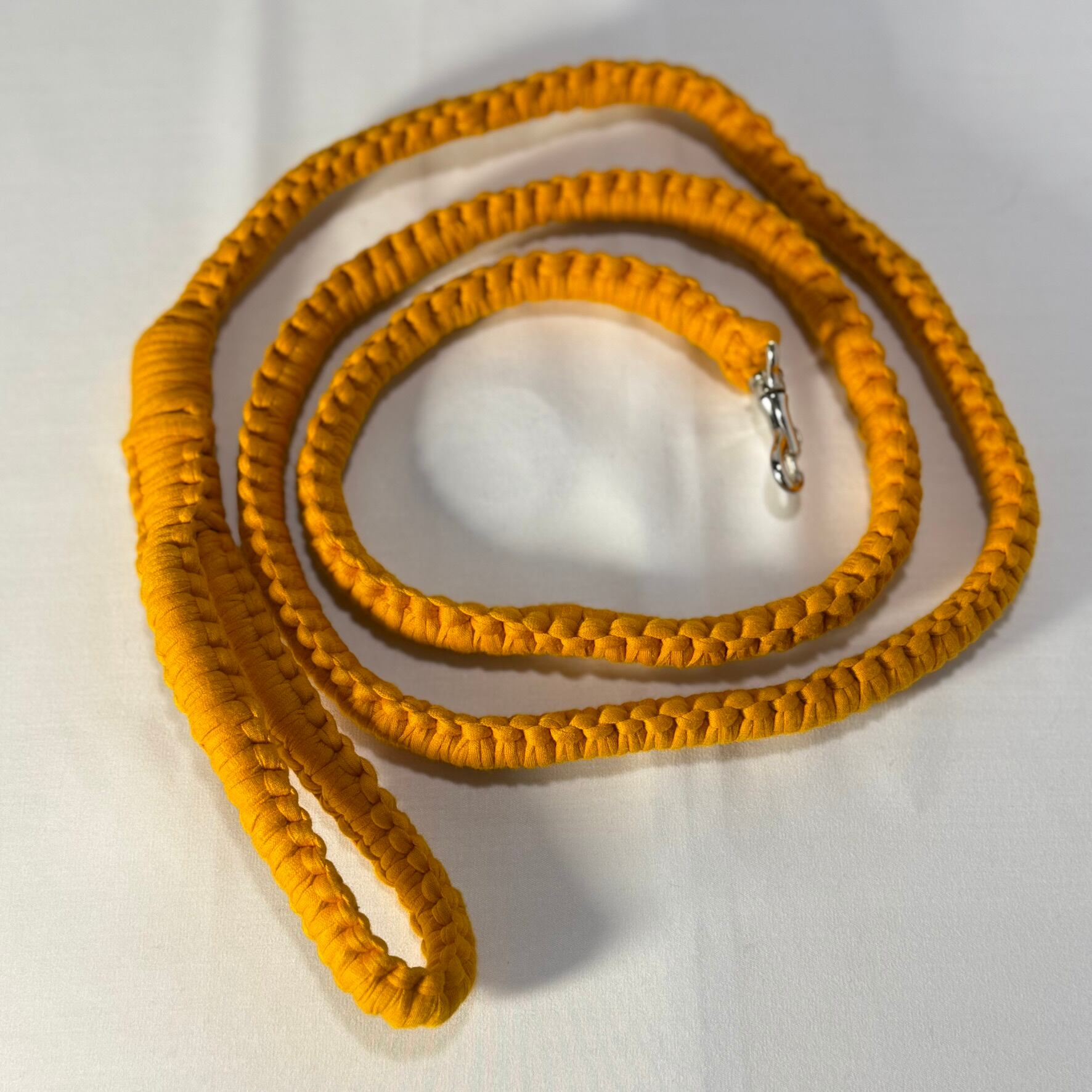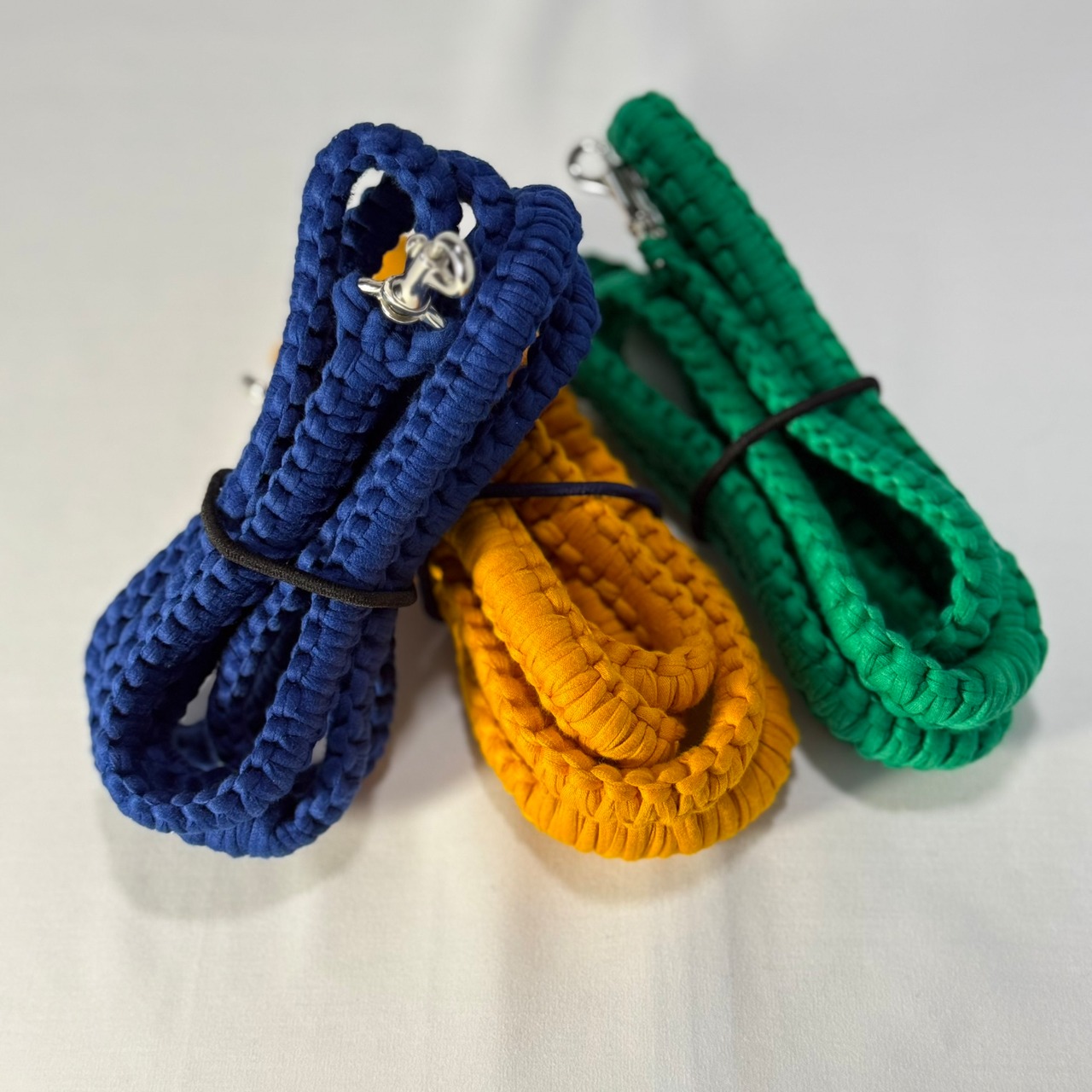 <愛犬のお散歩に>「マクラメ編み」で作られたドッグリードは、Tシャツ生地の端材をテープ状の糸にして結びながら編み込んでいるから、とてもしっかしとした仕上がり。ヴィヴィッドなカラーで、元気にお散歩が楽しめます。回転タイプのナスカン付き、10Kまでのワンちゃん、ネコちゃんに対応しています。