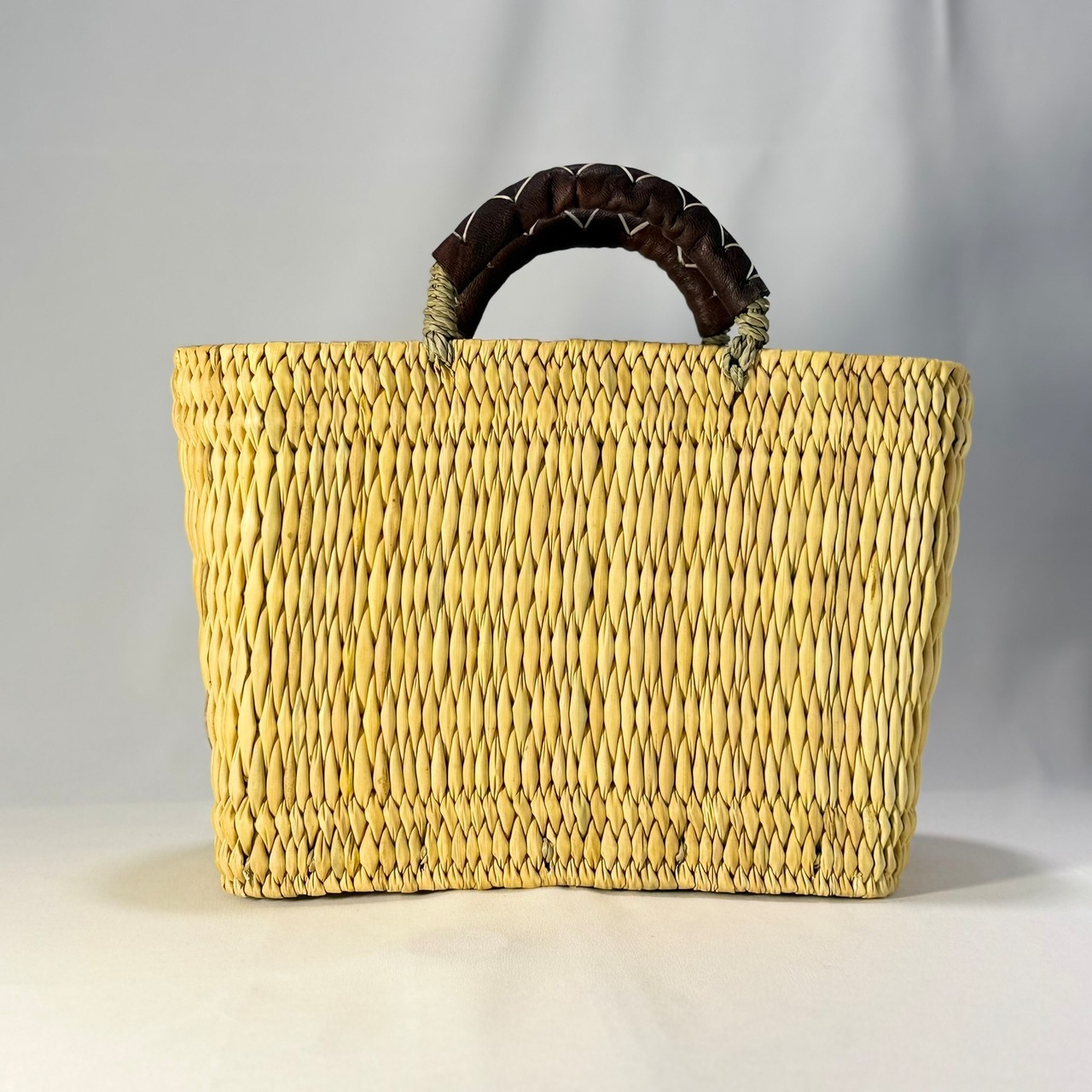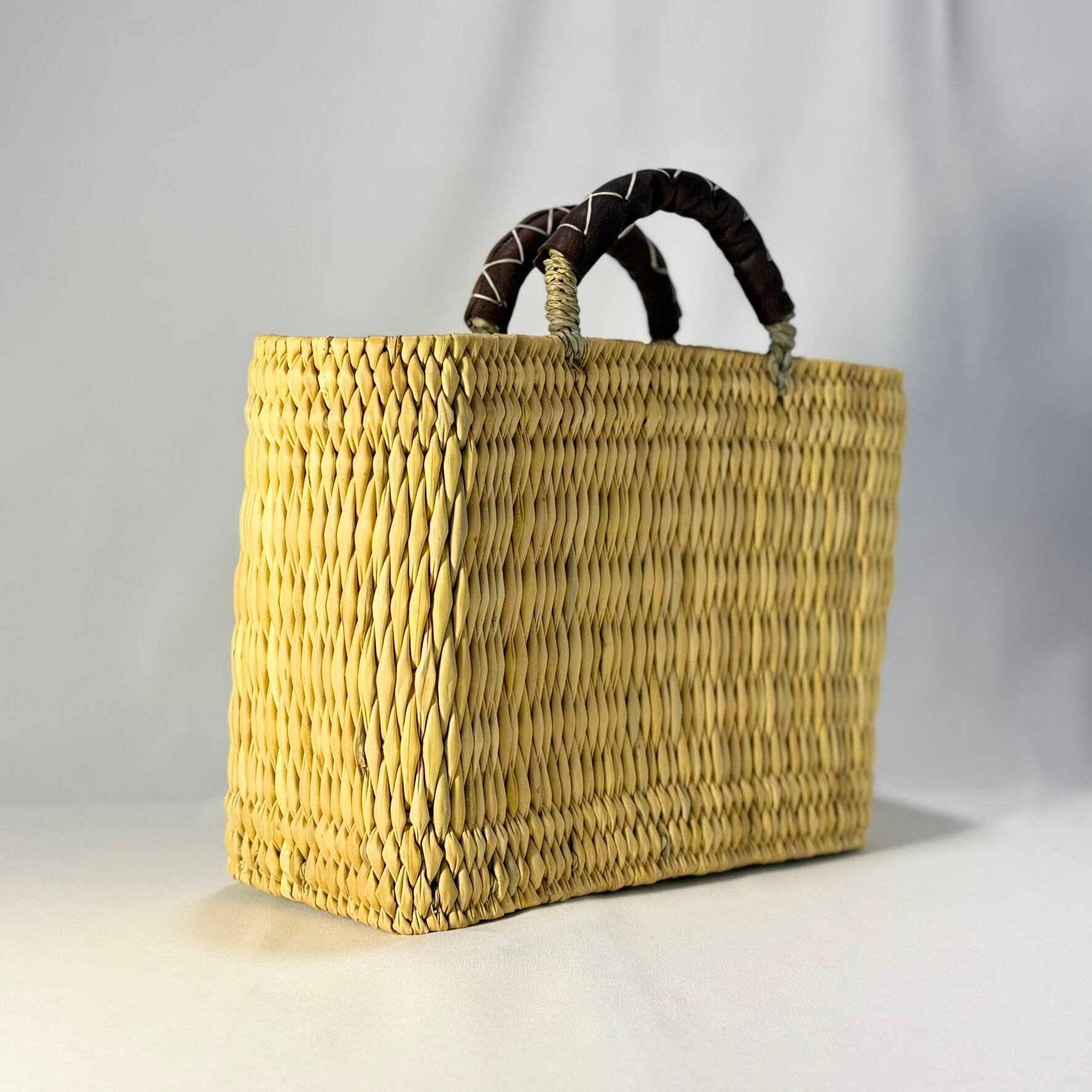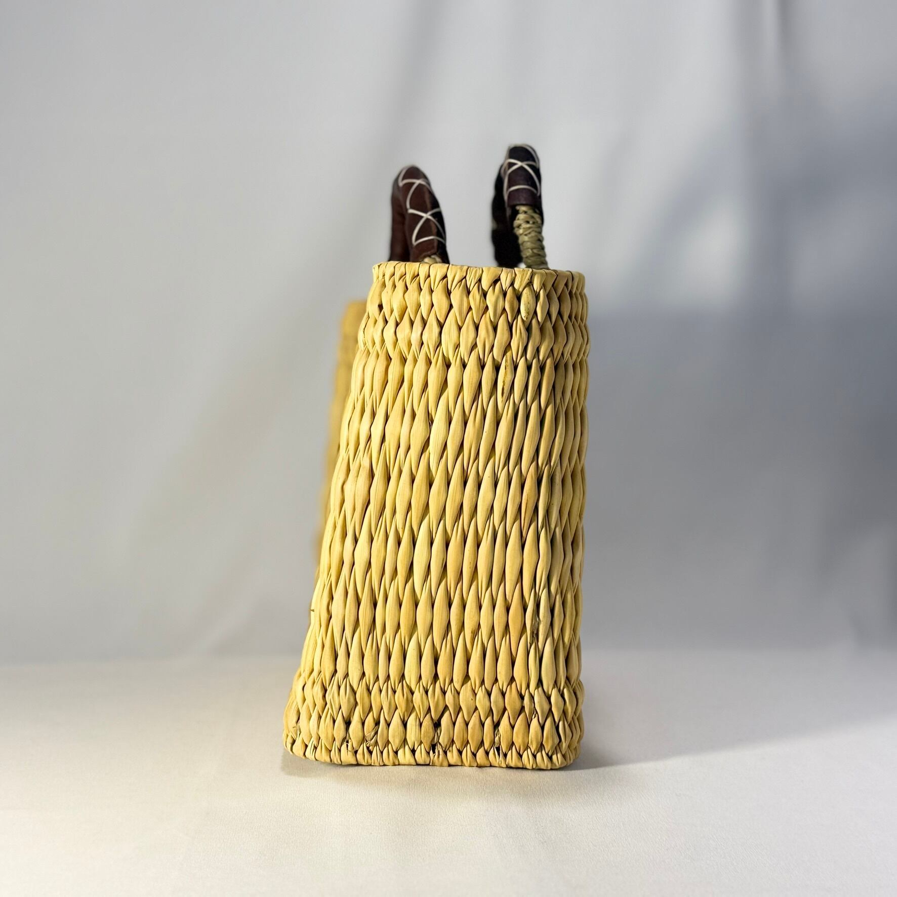 ストロー状の水草でしっかり編まれたスクエアタイプのかごバッグは、ハンドル部分にあしらったレザーのクロスステッチがポイントです。モロッコでJONK(ジョンク)と呼ばれる表面がツルツルした丈夫な素材は、ナチュラルな風合とたたみのような縦柄の編み目が人気です。どんなスタイルにも合わせやすく、お出かけやお買い物にはもちろん ピクニックなどのランチバッグとしても大活躍!しっかりとした作りで自立するので、雑誌やスリッパなどを入れるインテリアバスケットとしてもマルチにお使いいただけます。
