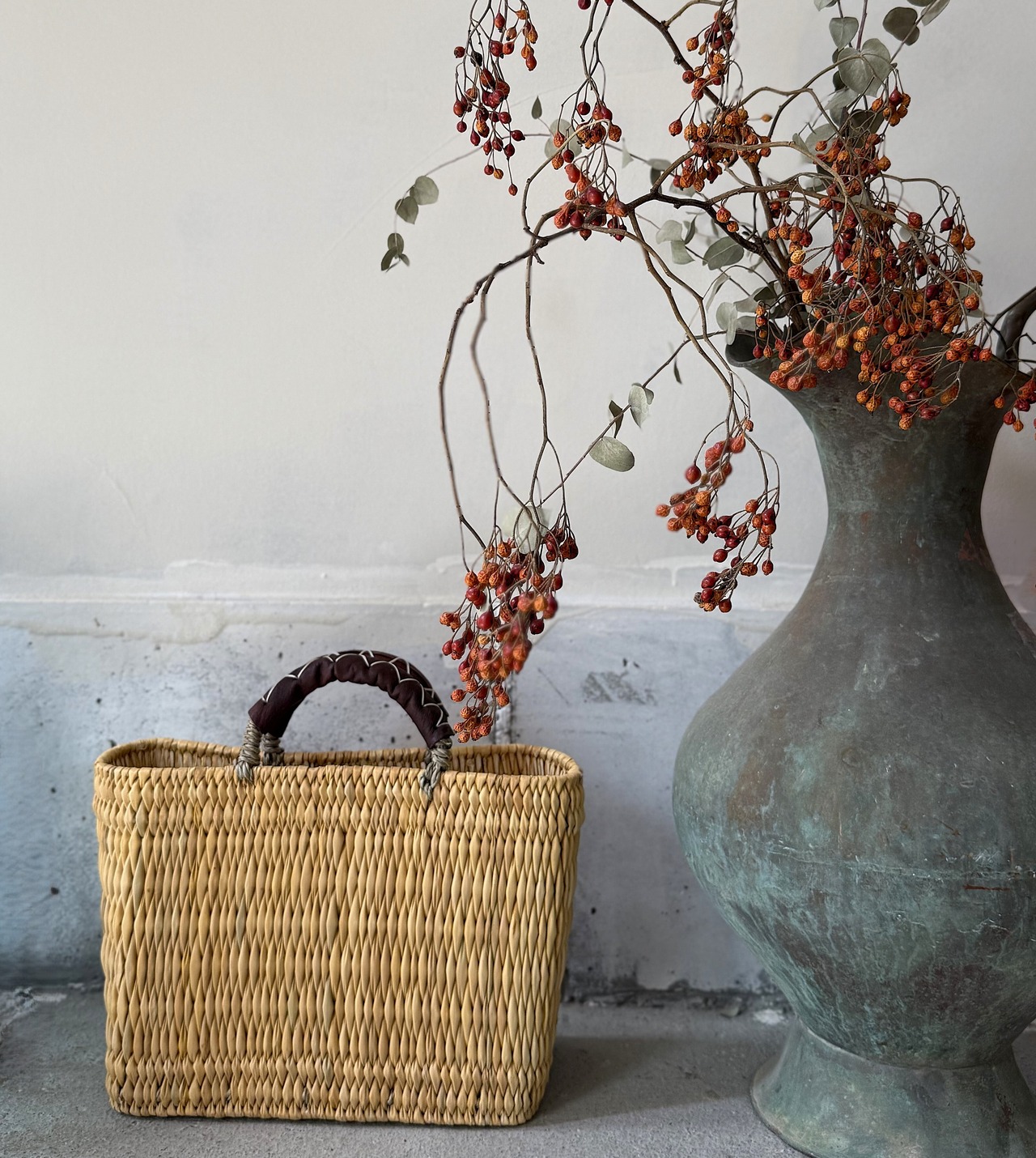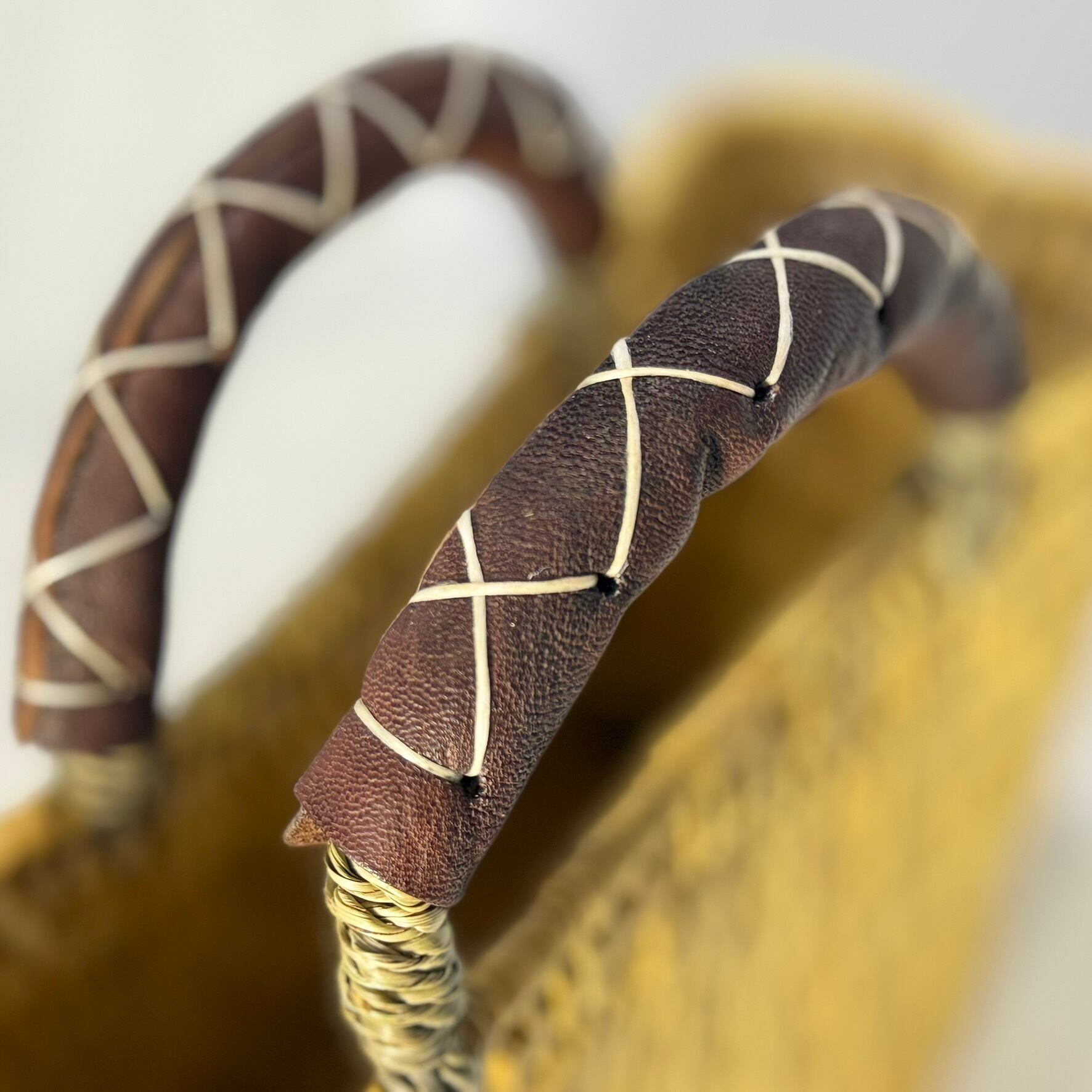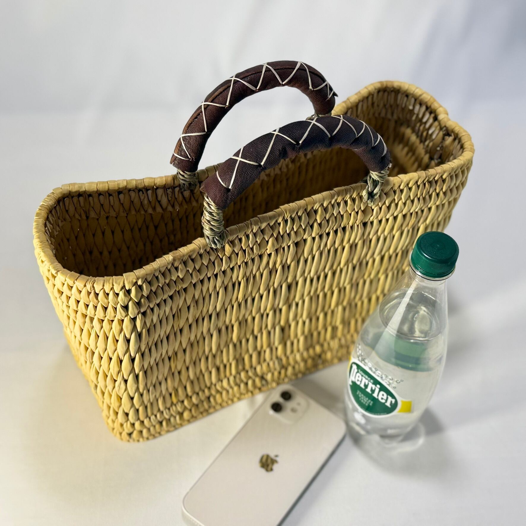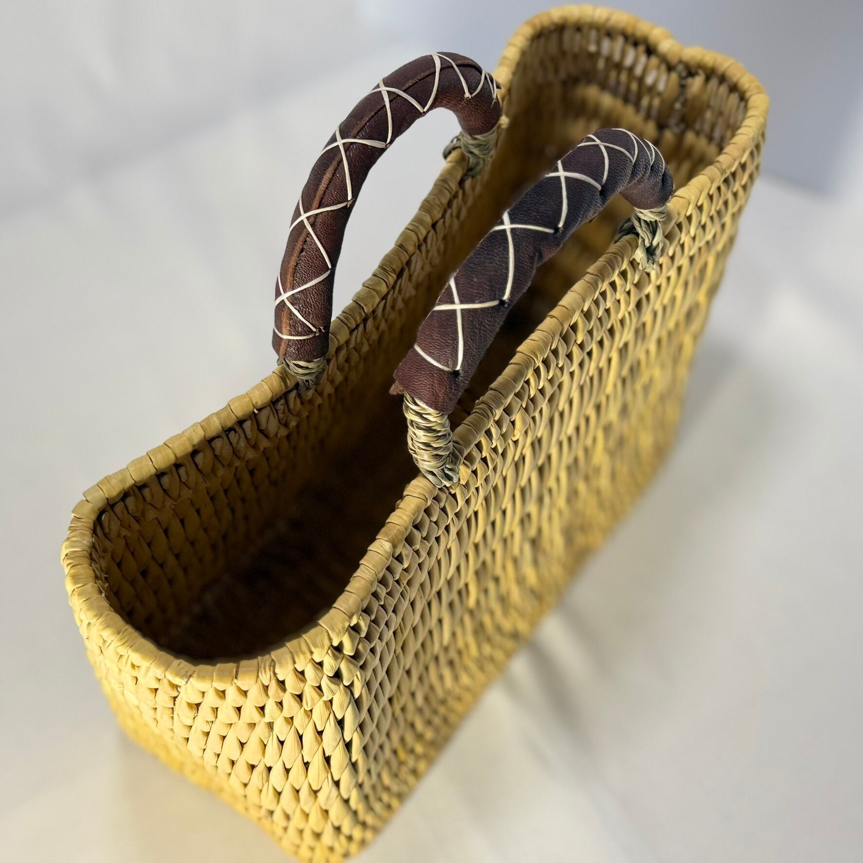 ストロー状の水草でしっかり編まれたスクエアタイプのかごバッグは、ハンドル部分にあしらったレザーのクロスステッチがポイントです。モロッコでJONK(ジョンク)と呼ばれる表面がツルツルした丈夫な素材は、ナチュラルな風合とたたみのような縦柄の編み目が人気です。どんなスタイルにも合わせやすく、お出かけやお買い物にはもちろん ピクニックなどのランチバッグとしても大活躍!しっかりとした作りで自立するので、雑誌やスリッパなどを入れるインテリアバスケットとしてもマルチにお使いいただけます。