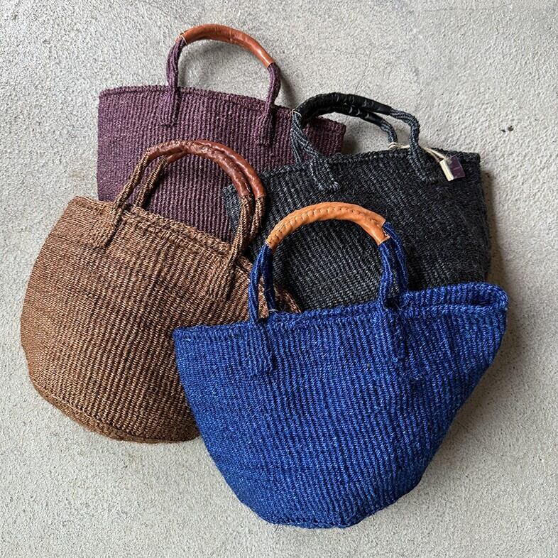 これからの季節に大活躍!アフリカのケニアから届いたサイザル素材のかごバッグです。身の回りのものがちょうど収納できるサイズ感、定番のころんとしたトート形が人気のデザインに、ハンドル部分は革巻きを施して持ち易さと高級感をプラス。ハンドル革の風合いが使うほどに手になじみ、長く愛用していただけます。サイザルのバスケットはとても丈夫。素朴でナチュラルな風合いを楽しみつつ、経年変化をお楽しみください。