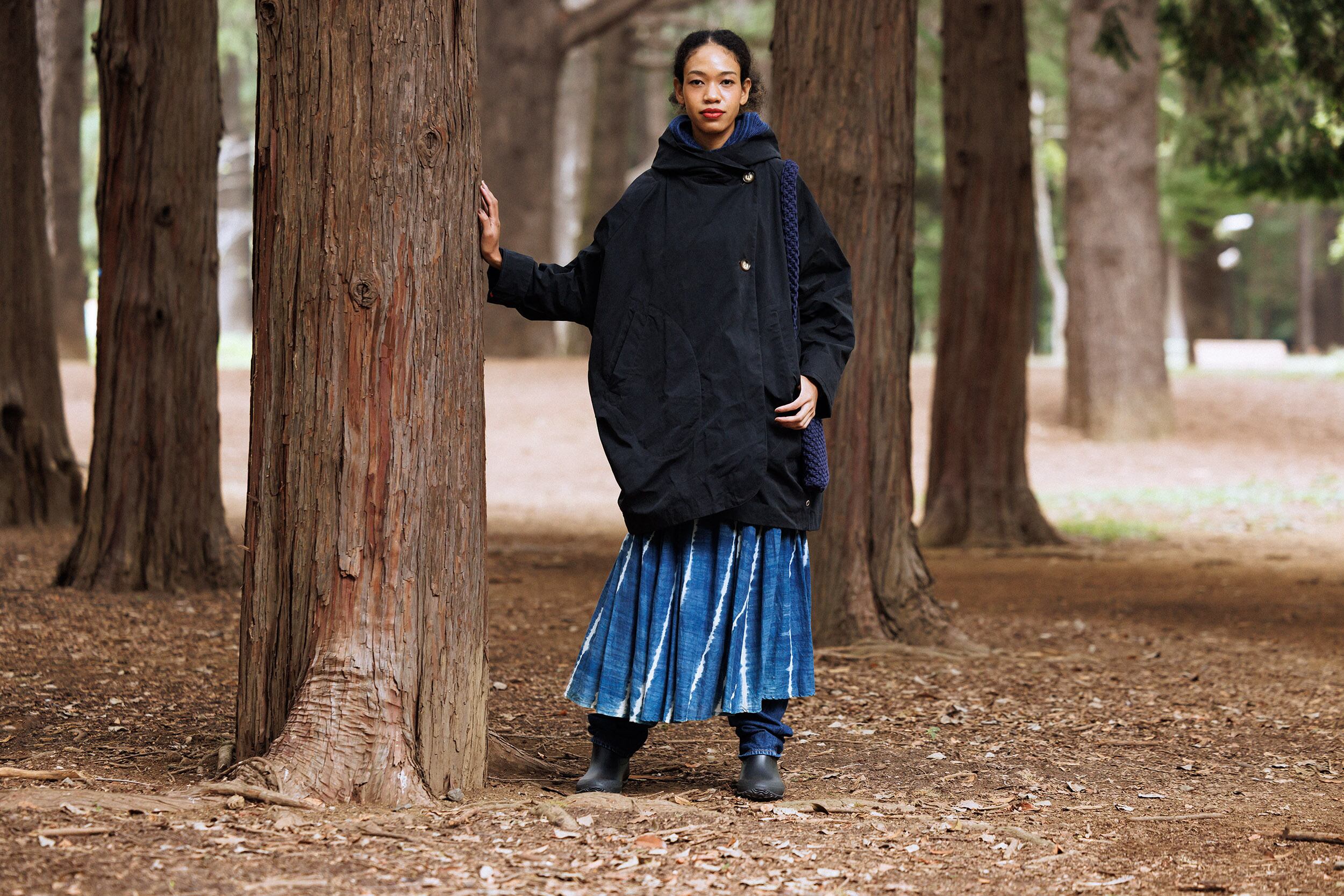 インドのシアーなコットン地をたっぷりと使ったフレアー分量と長めの丈、そして透け感が気にならない裏地付きの仕立てがリッチです。ボリュームがありながらもウエスト周りはすっきりとしたパターンに仕上げ、ウエストのゴム仕様でイージーでストレスフリーな着心地です。