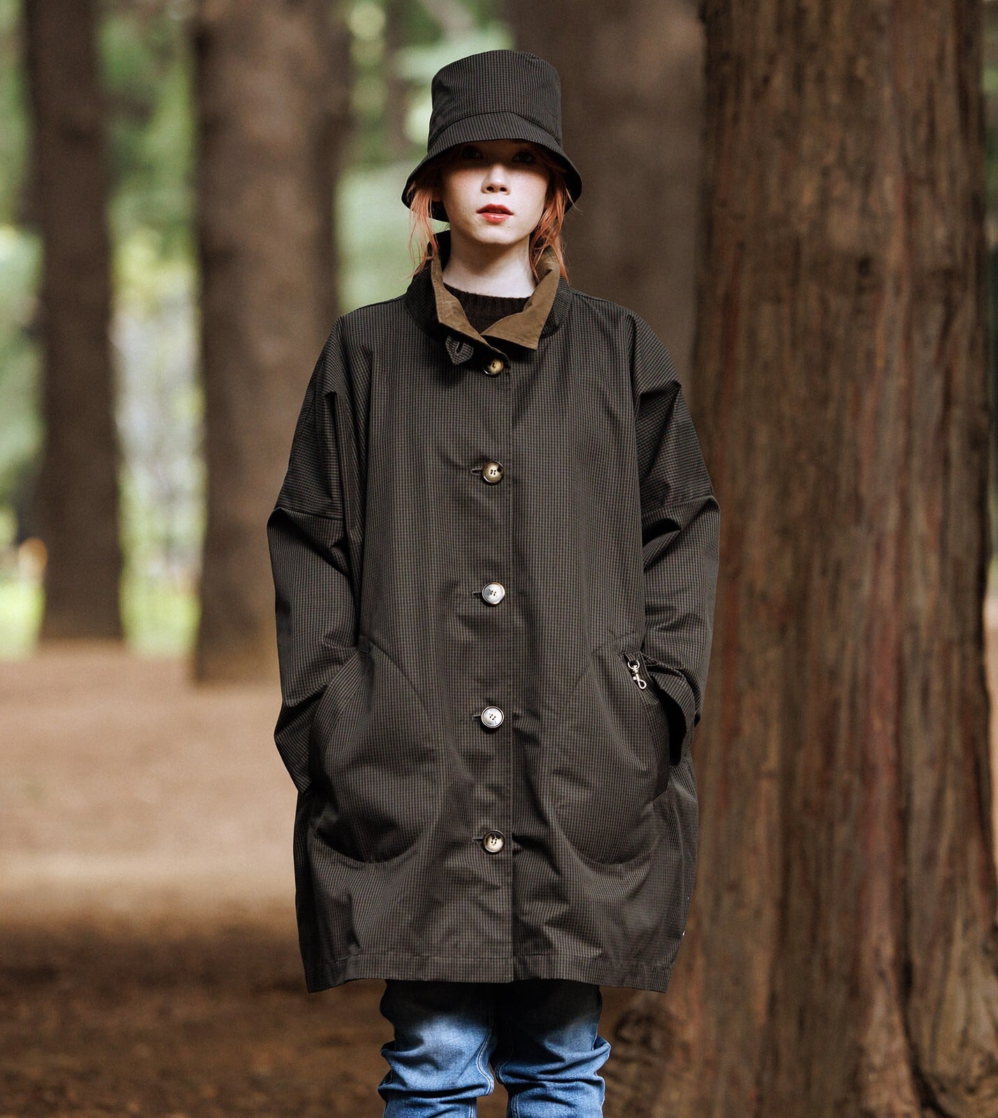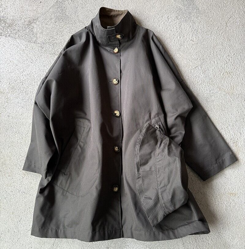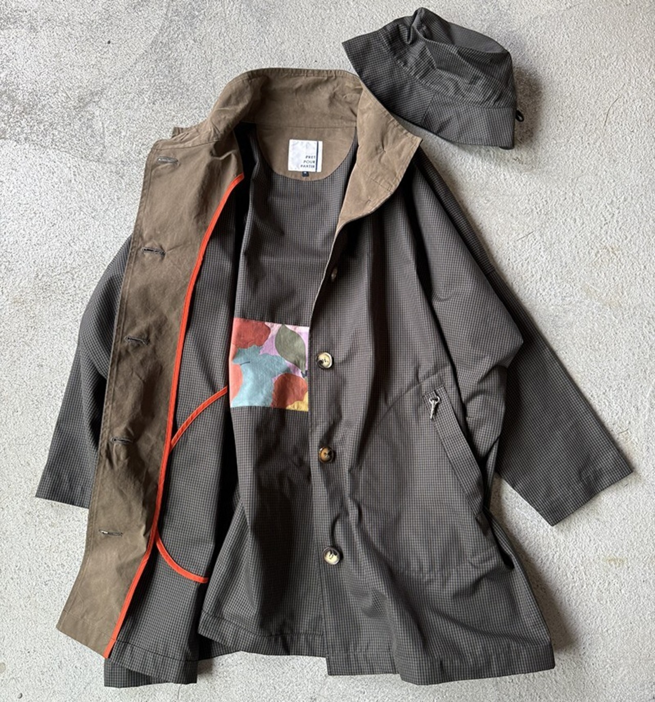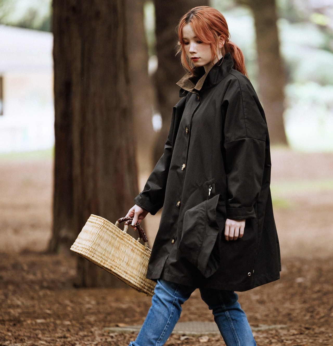 高めのスタンドカラーにお揃いのハットをセットにした、コクーンフォルムのゆったりコート。しっかりとしたコットンのミニチェックは、トレンド感とベーシックを合わせ持つ、絶妙な色合いです。一重仕立ての縫い代はオレンジカラーのパイピングを、ウエストの内側にはオリジナルプリントをあしらい、内側まで見せたくなるような凝った仕様がポイントです。ベストやライトダウンなどをレイヤードすれば、寒い季節まで長く着られます。
