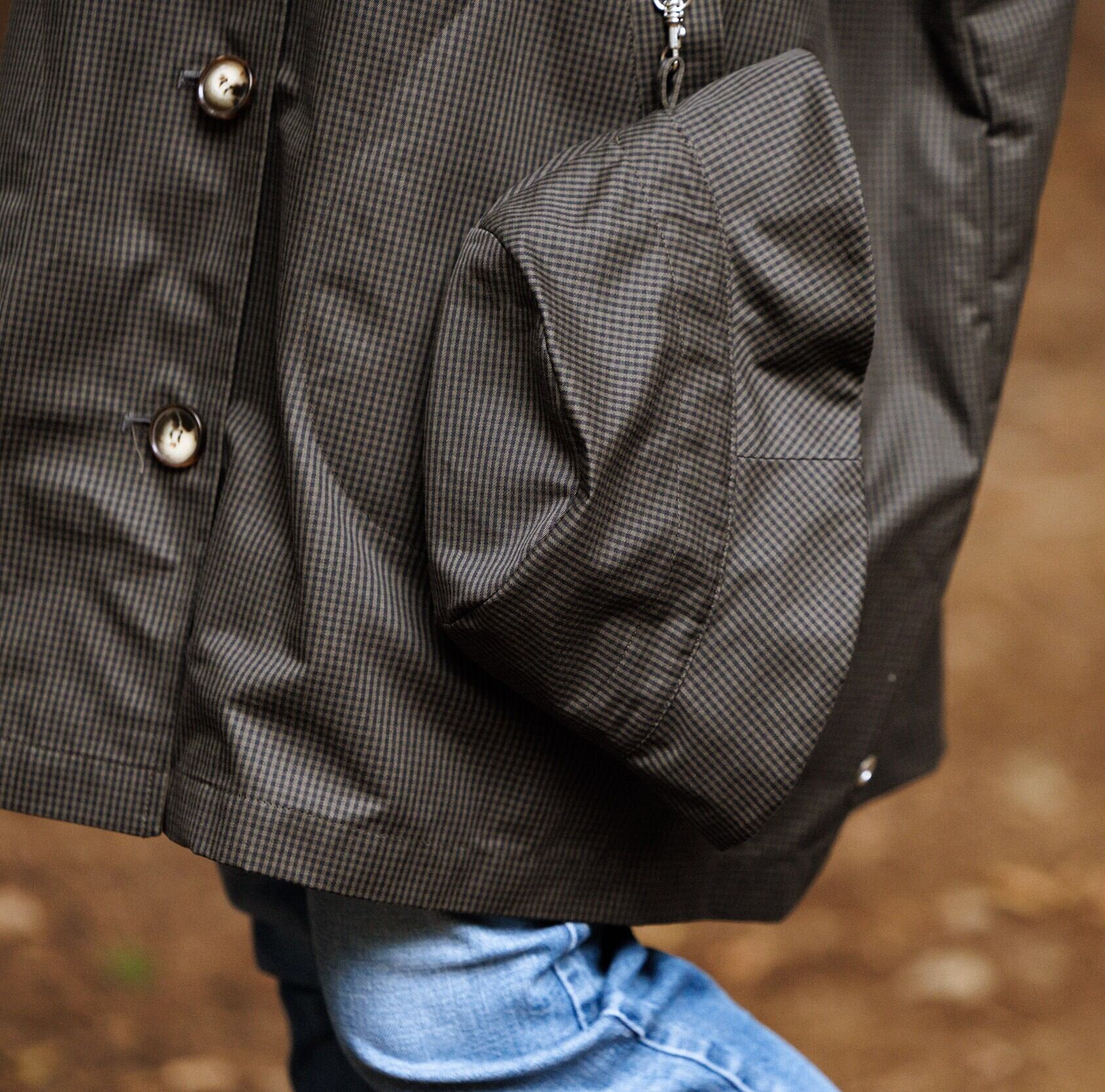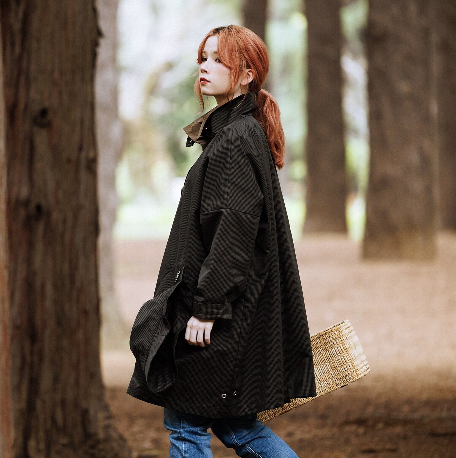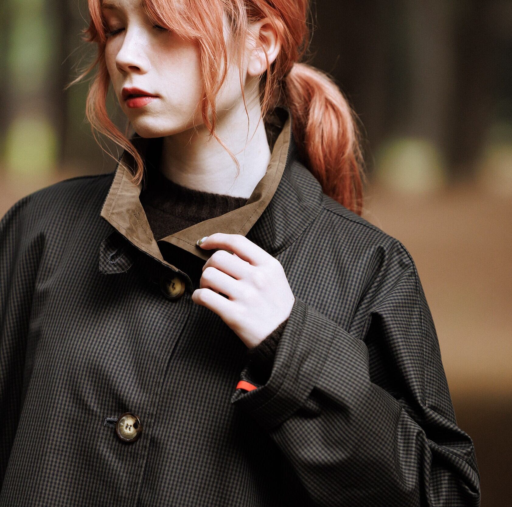 高めのスタンドカラーにお揃いのハットをセットにした、コクーンフォルムのゆったりコート。しっかりとしたコットンのミニチェックは、トレンド感とベーシックを合わせ持つ、絶妙な色合いです。一重仕立ての縫い代はオレンジカラーのパイピングを、ウエストの内側にはオリジナルプリントをあしらい、内側まで見せたくなるような凝った仕様がポイントです。ベストやライトダウンなどをレイヤードすれば、寒い季節まで長く着られます。