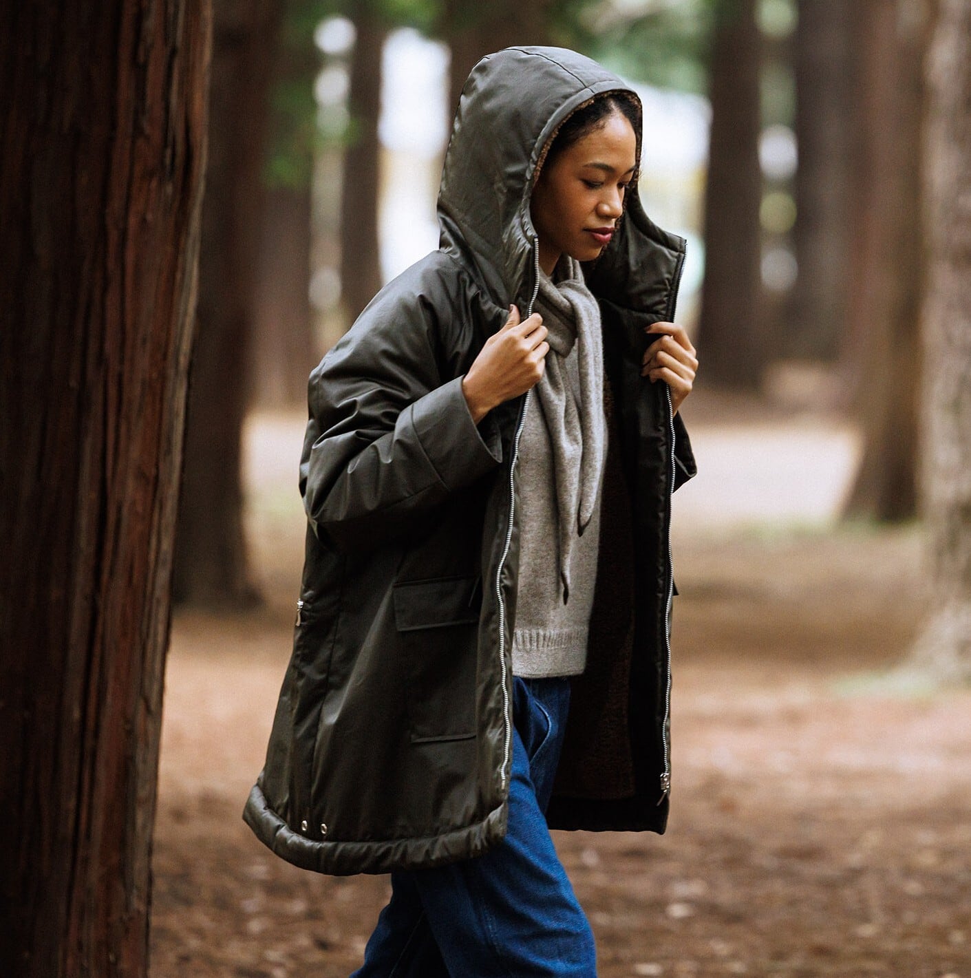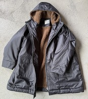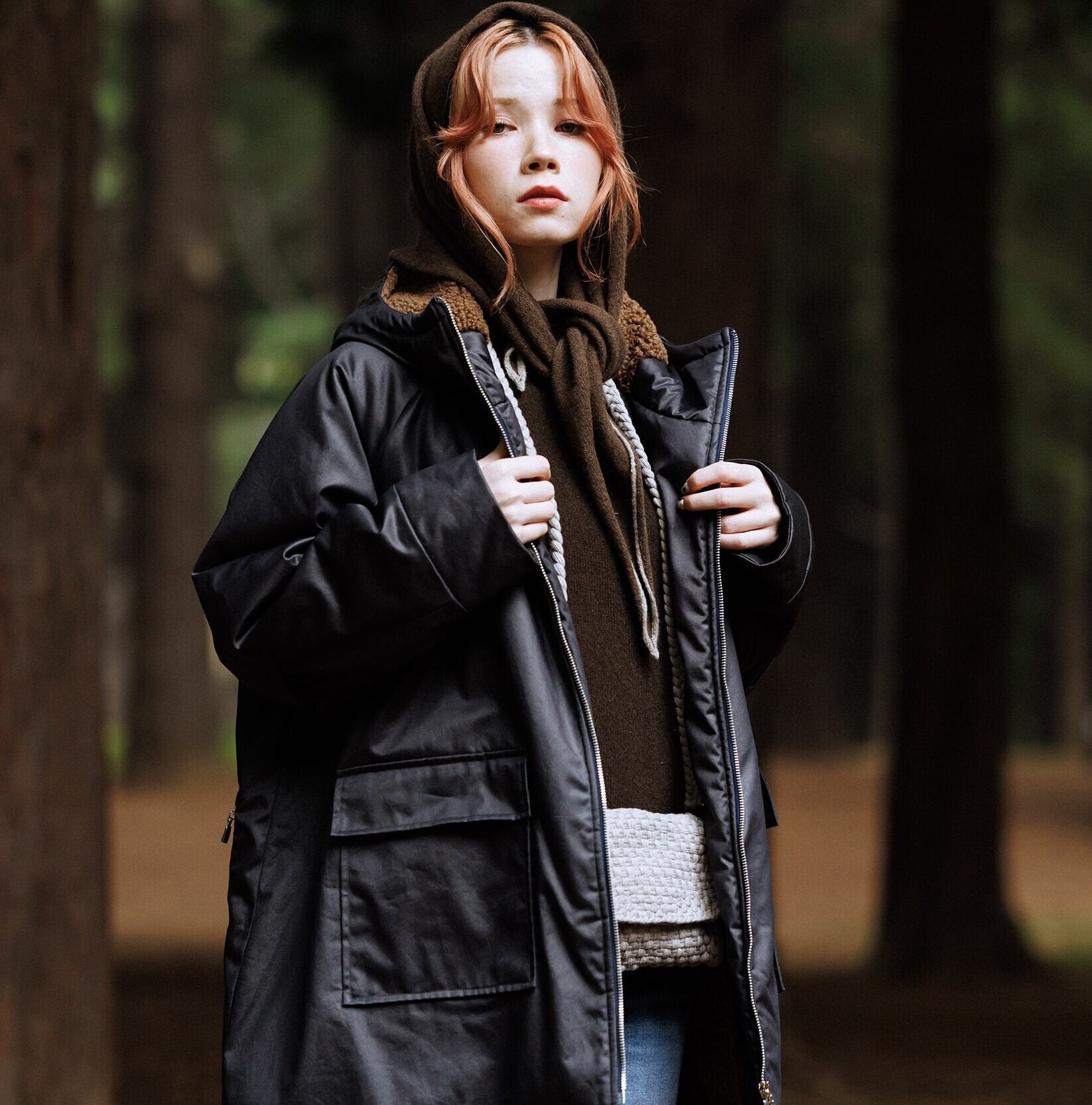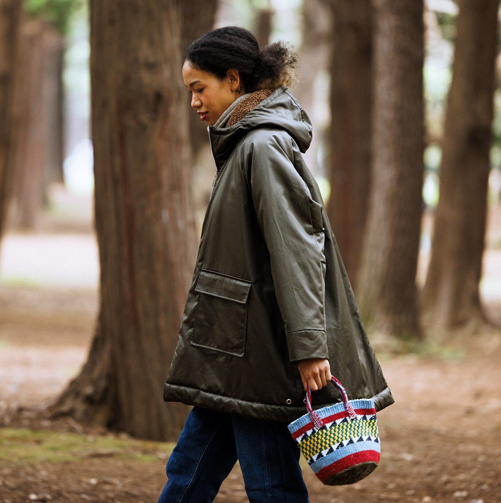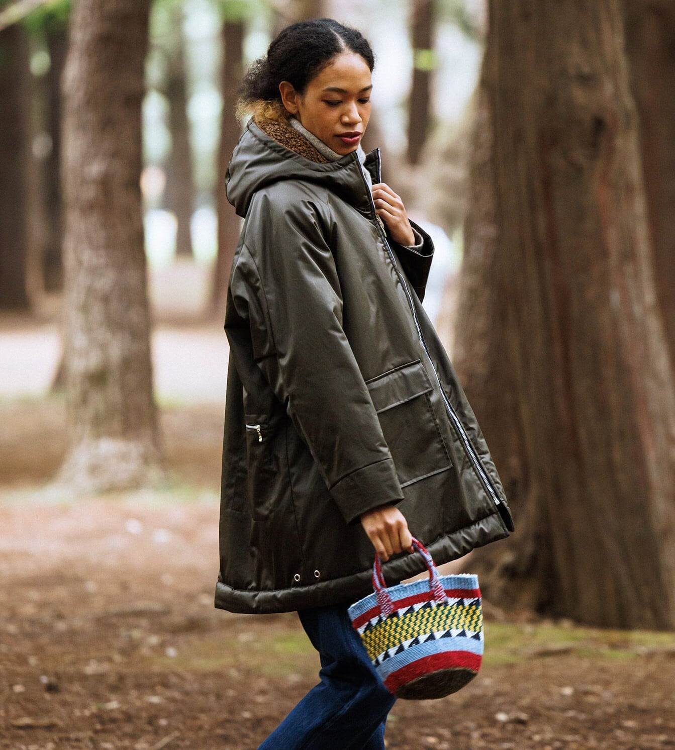 ツヤのある生地とクルっとした茶色のボアのコンビネーションが絶妙なモッズ風コート。後ろ下がりになっているテントラインのシルエットにフロントが高めのスタンドカラーにデザインされたフードを合わせて、着映えと暖かさを両立させています。