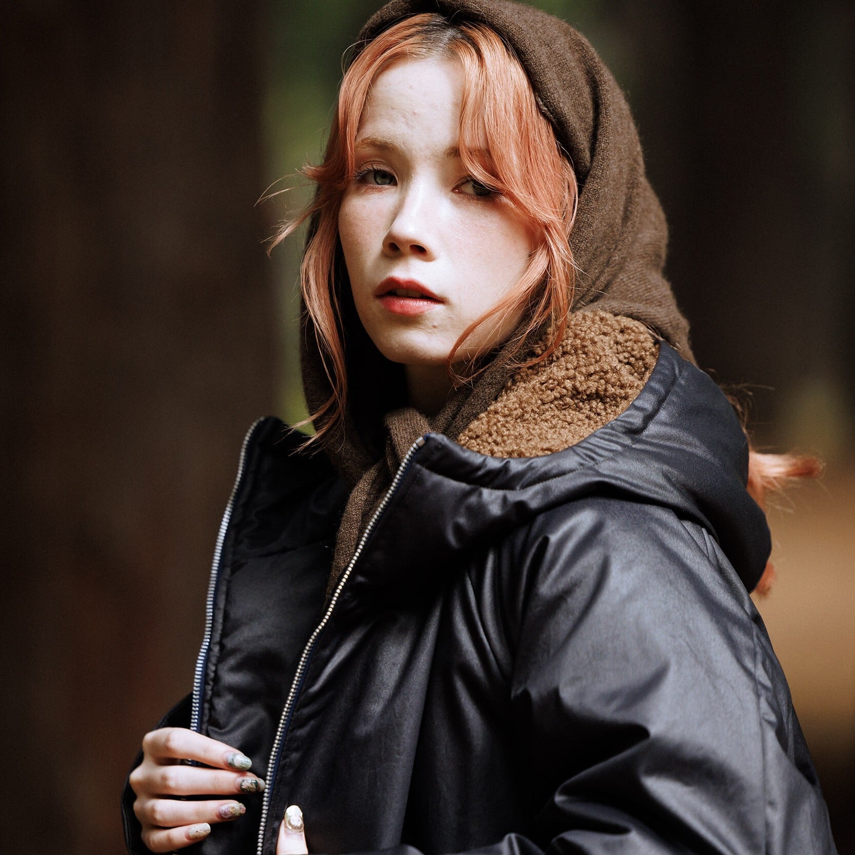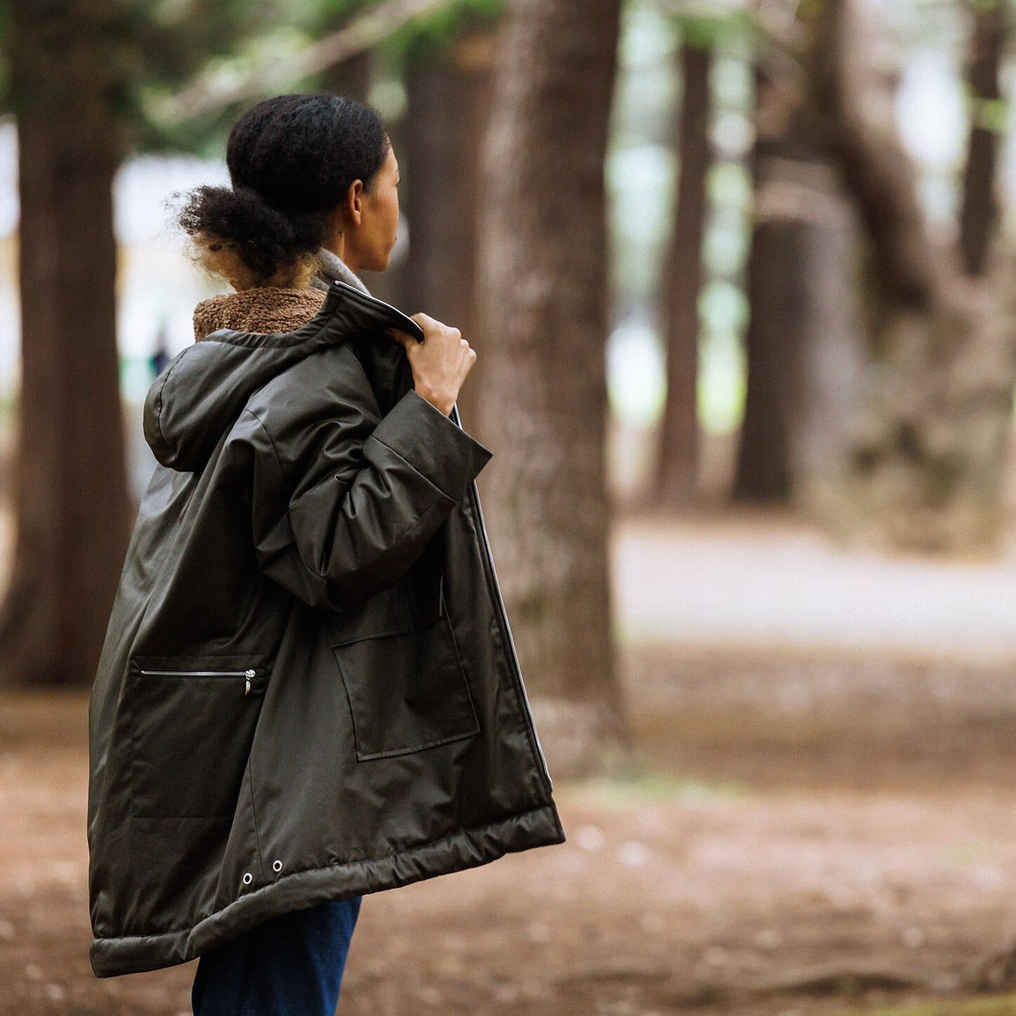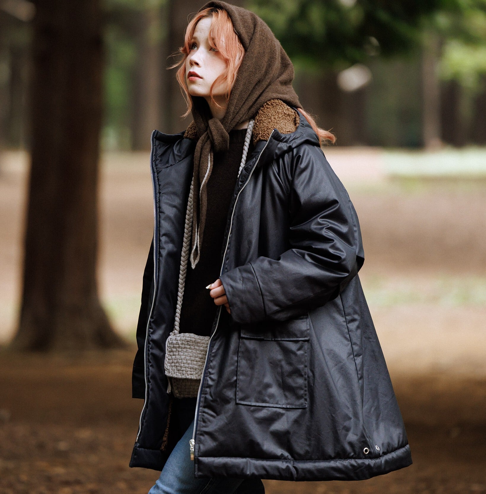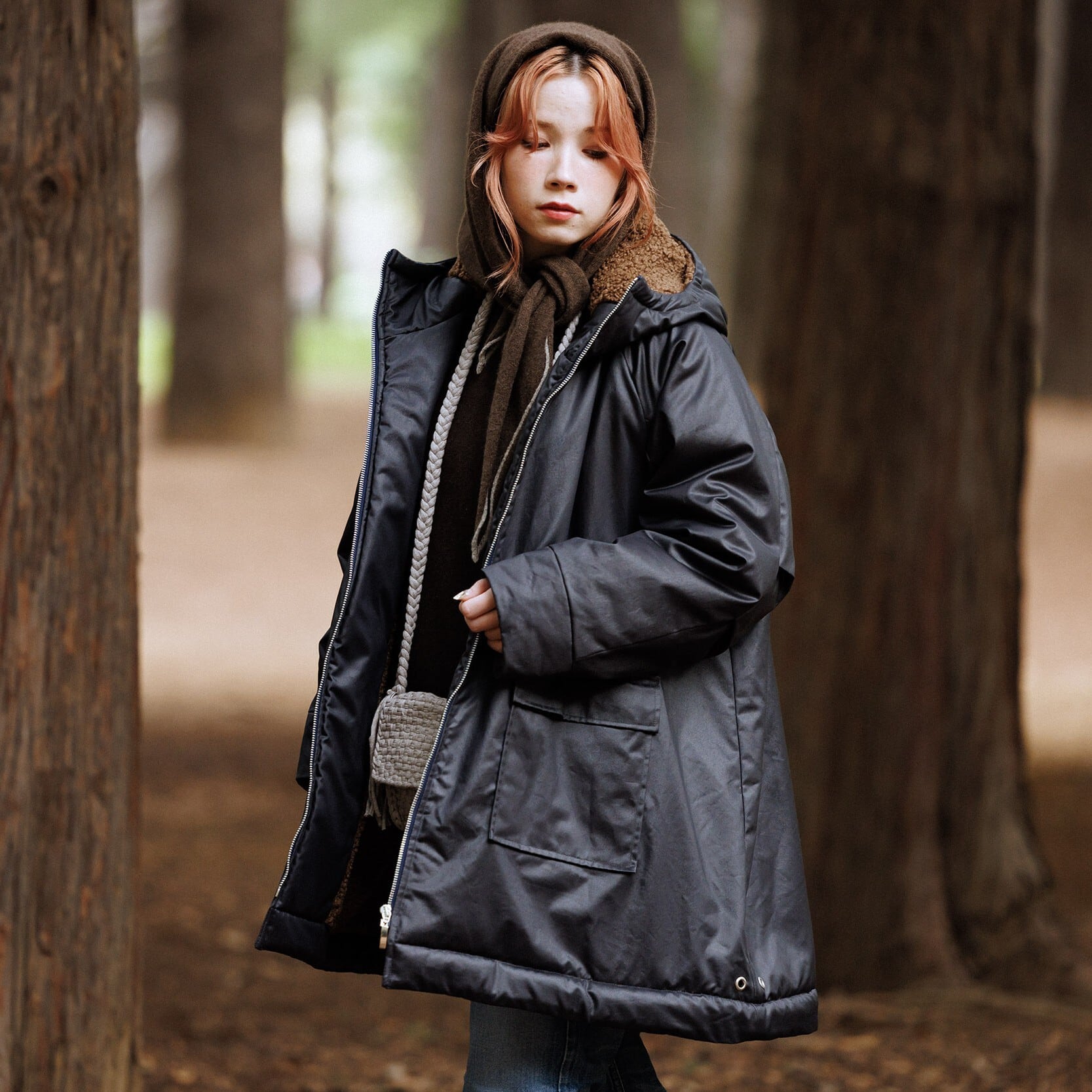 ツヤのある生地とクルっとした茶色のボアのコンビネーションが絶妙なモッズ風コート。後ろ下がりになっているテントラインのシルエットにフロントが高めのスタンドカラーにデザインされたフードを合わせて、着映えと暖かさを両立させています。