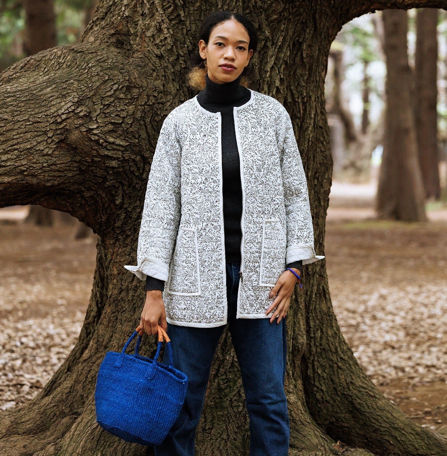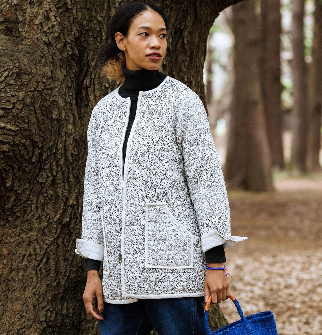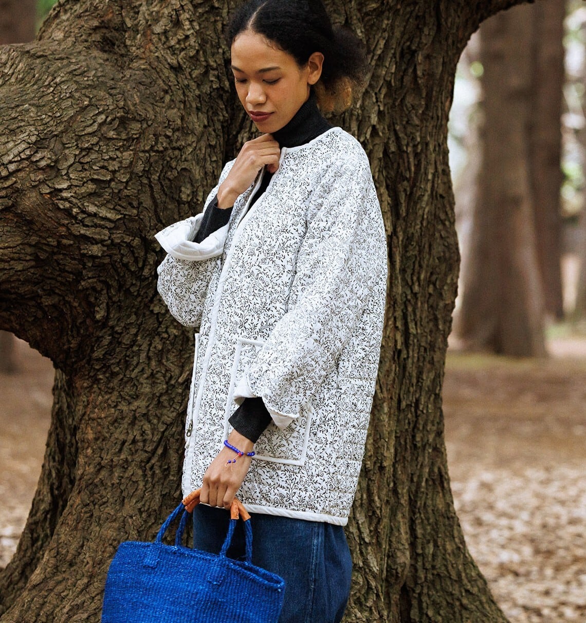 手彫りの木製の版をスタンプのように布に押し当てていく伝統的な技法「ブロックプリント」で表現した小花柄。ホワイトのベースにブラック1色で表現したシンプルな配色は、汚れやすい技法のためとても珍しく、熟練の職人にしかできません。無地の裏地との間に薄手の中わたを挟んだキルティングは、三角形をつなぎ合わせた六角形型。内側はすべてパイピング仕様で、丁寧に仕立てました。