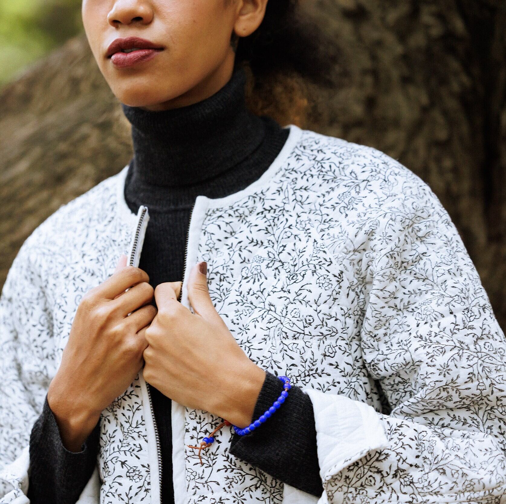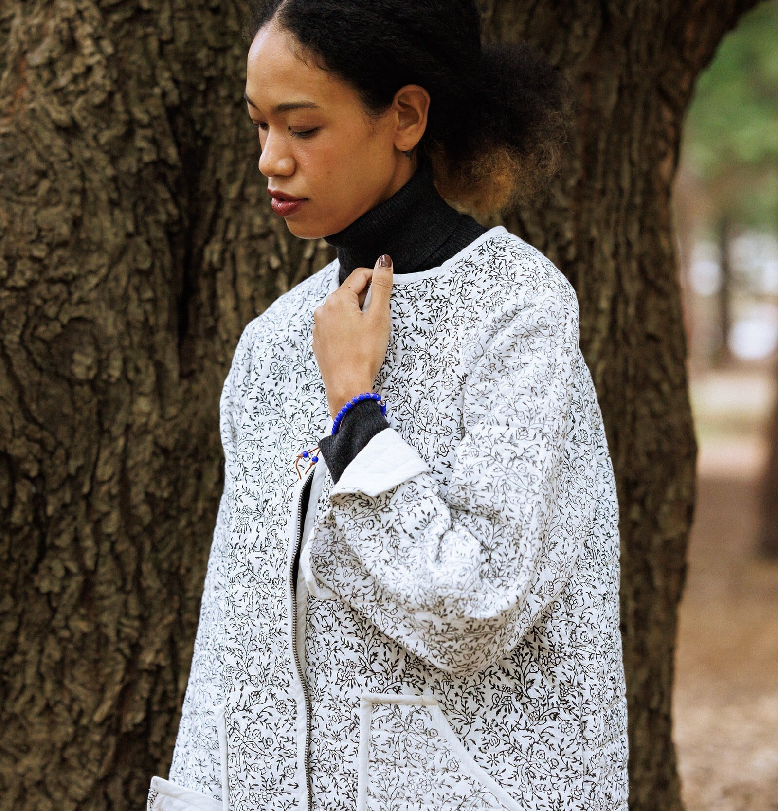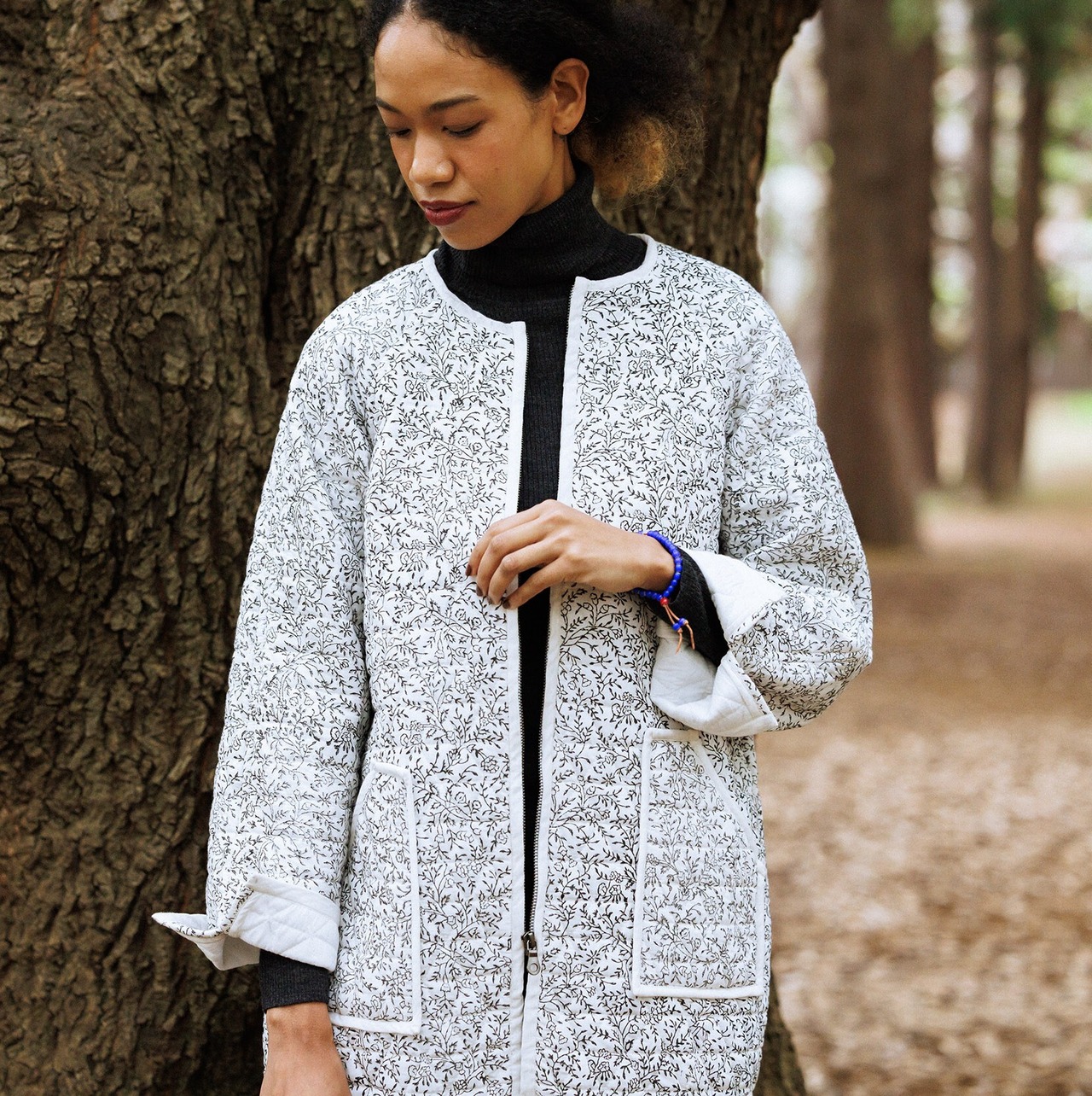 手彫りの木製の版をスタンプのように布に押し当てていく伝統的な技法「ブロックプリント」で表現した小花柄。ホワイトのベースにブラック1色で表現したシンプルな配色は、汚れやすい技法のためとても珍しく、熟練の職人にしかできません。無地の裏地との間に薄手の中わたを挟んだキルティングは、三角形をつなぎ合わせた六角形型。内側はすべてパイピング仕様で、丁寧に仕立てました。