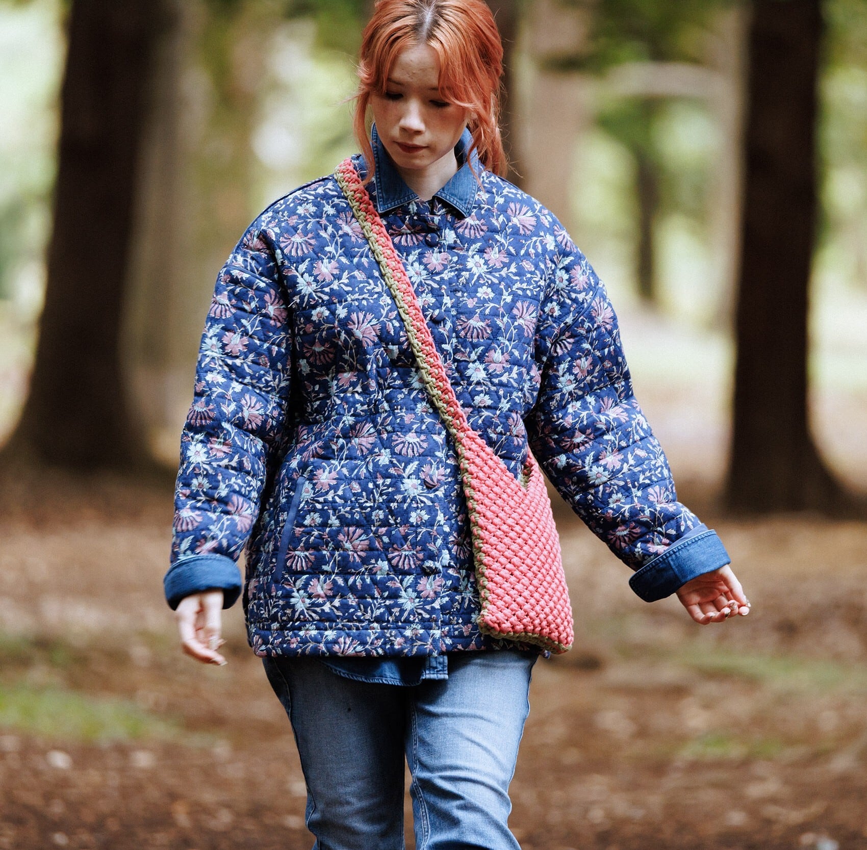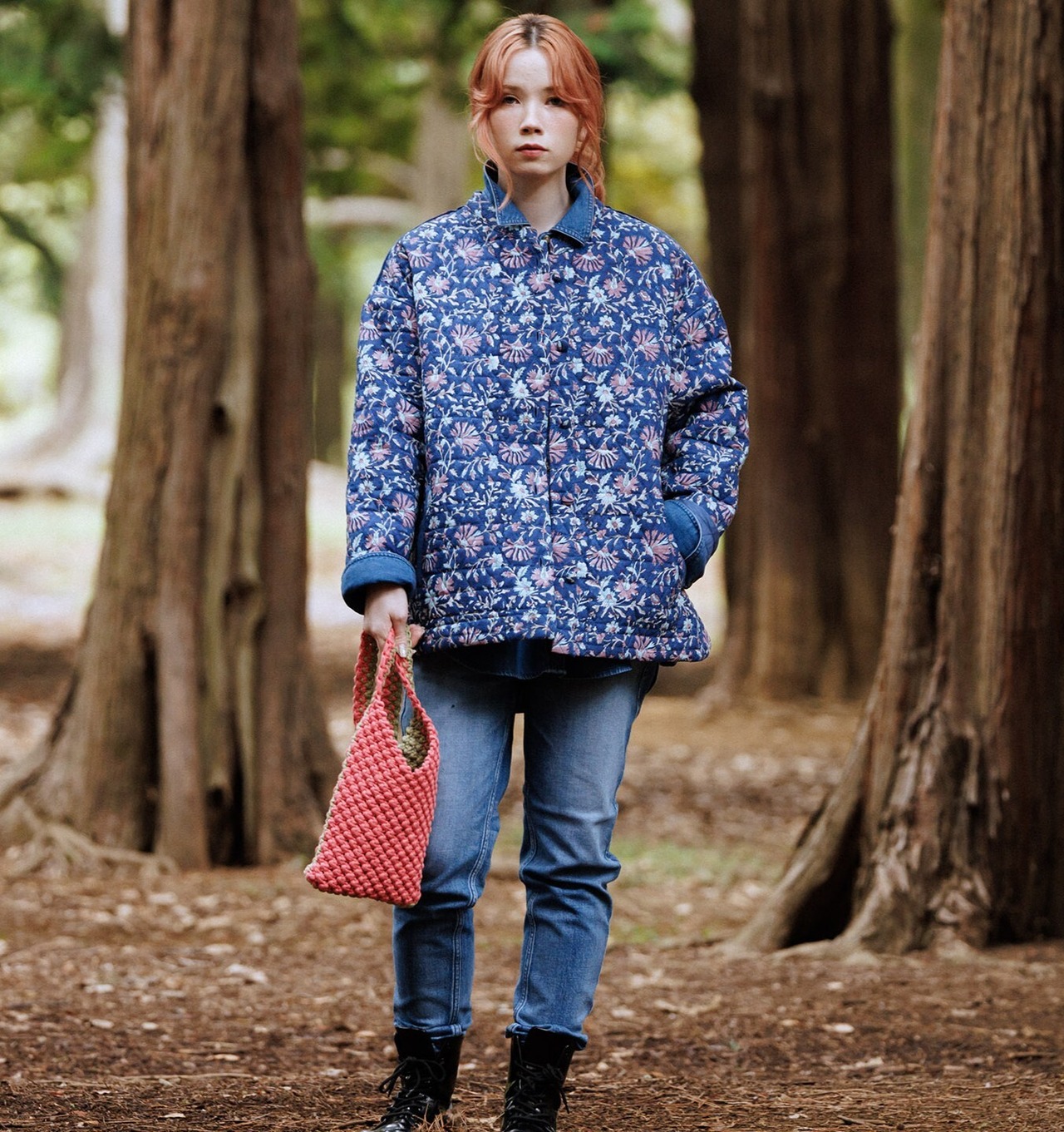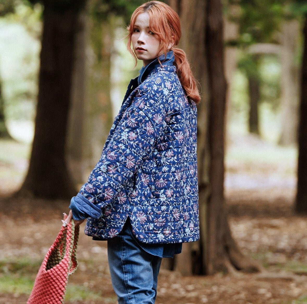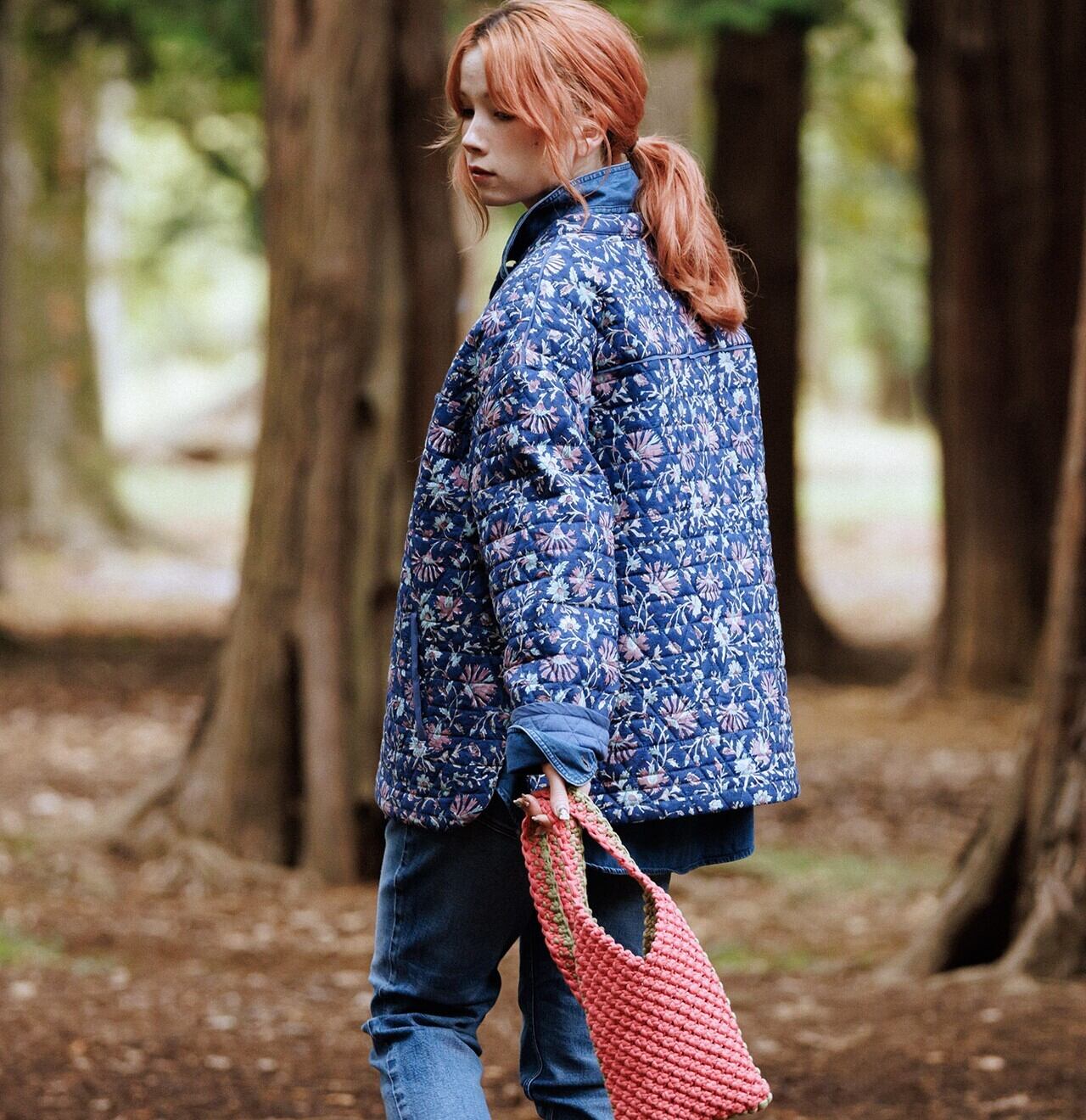 手彫りの木製の版をスタンプのように布に押し当てていく伝統的な技法「ブロックプリント」で表現した草花柄は、インディゴ風の藍色をベースに淡いピンクやブルーの小花をバランスよく散らして優しい表情に。ハンドプリントによる色ムラや版ズレが甘くなりすぎず、味わいのある仕上がりです。無地の裏地との間に薄手の中わたを挟んだキルティングは、三角形をつなぎ合わせた六角形型。内側はすべてパイピング仕様で、丁寧に仕立てました。