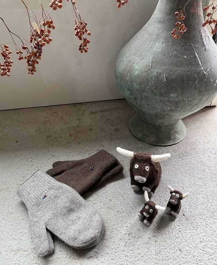 モンゴル北部の針葉樹が立ち並ぶツンドラ地帯、標高2,000mを超える地域に生息するヤクは、長毛が特徴のウシ科の動物。冬には-50℃にもなる極寒の環境から命を守るため、優れた保温力のうぶ毛(ダウン)を蓄えています。空気をたっぷりと含んだその高い保温力の一方で、吸湿発散性や通気性が良く暖かく蒸れにくい、快適な着心地が特徴です。また繊維が丈夫で、使い込むほどに風合いが増して愛着が湧く… そんなマテリアルです。