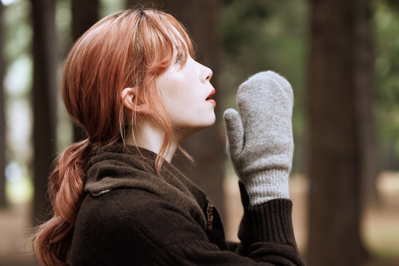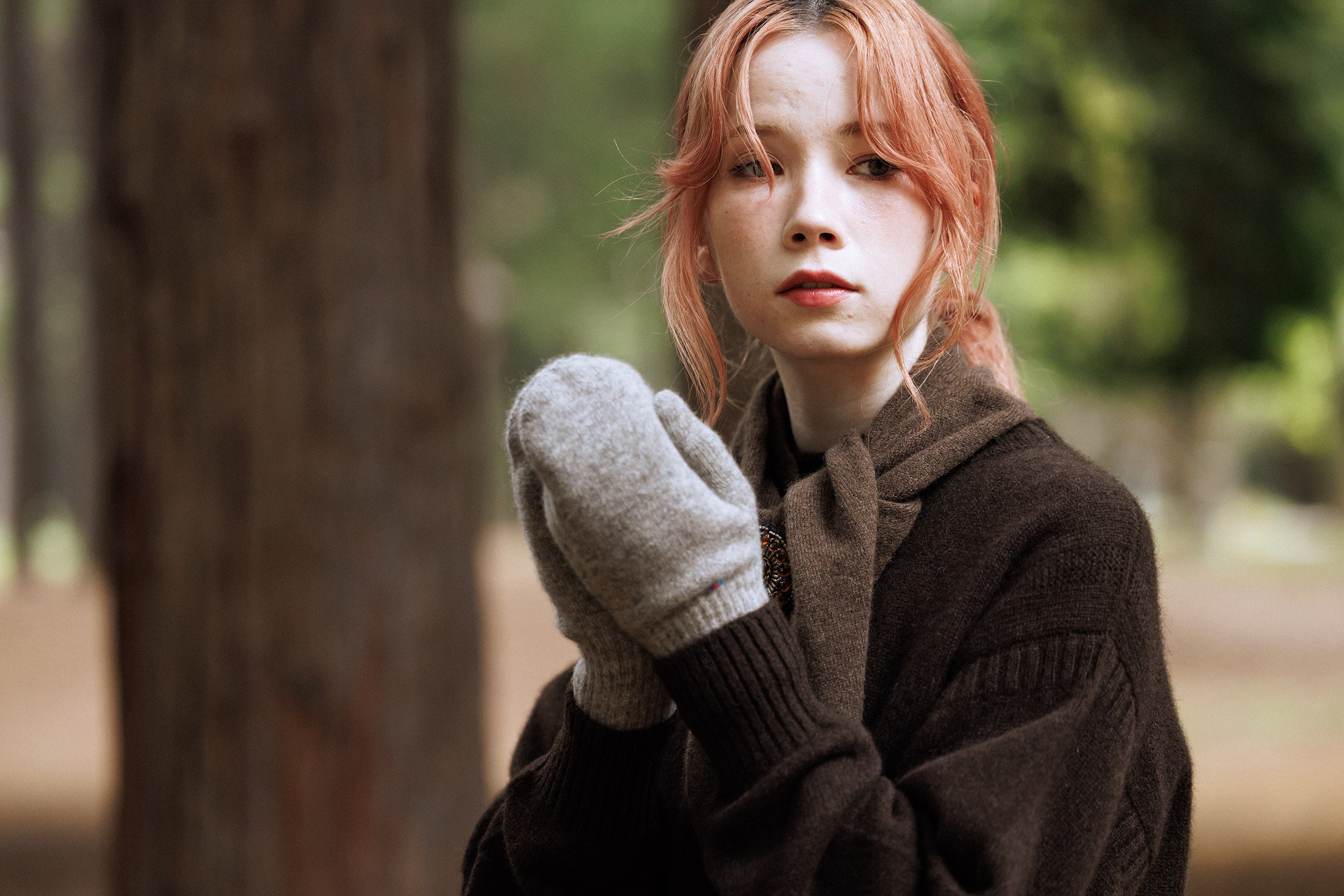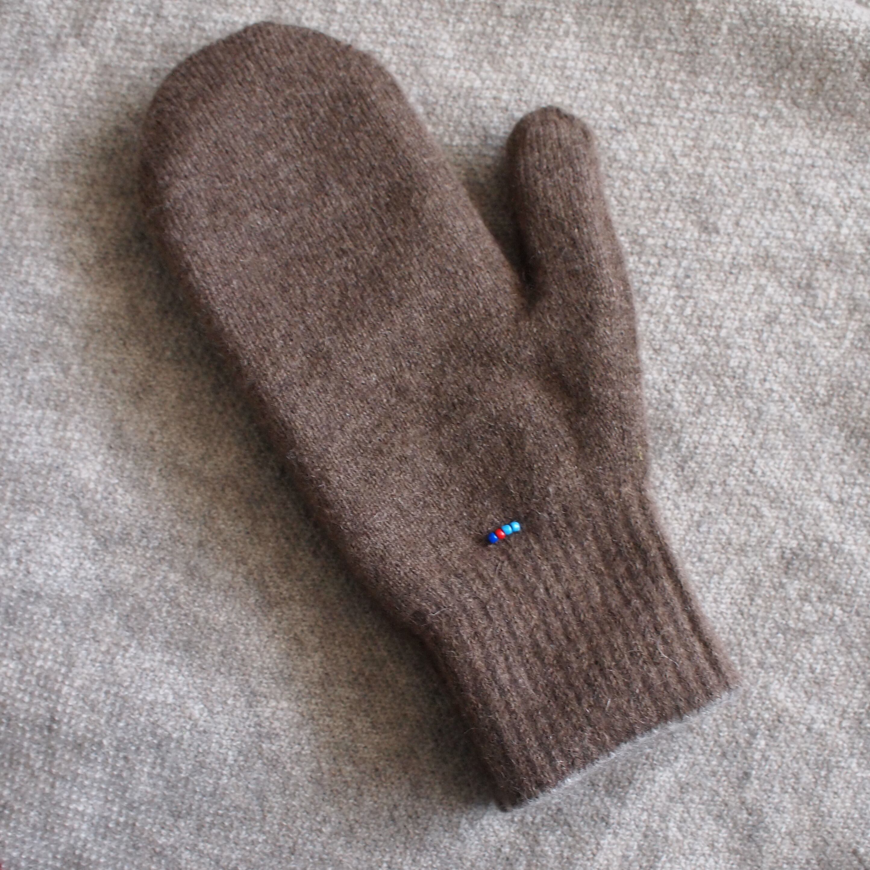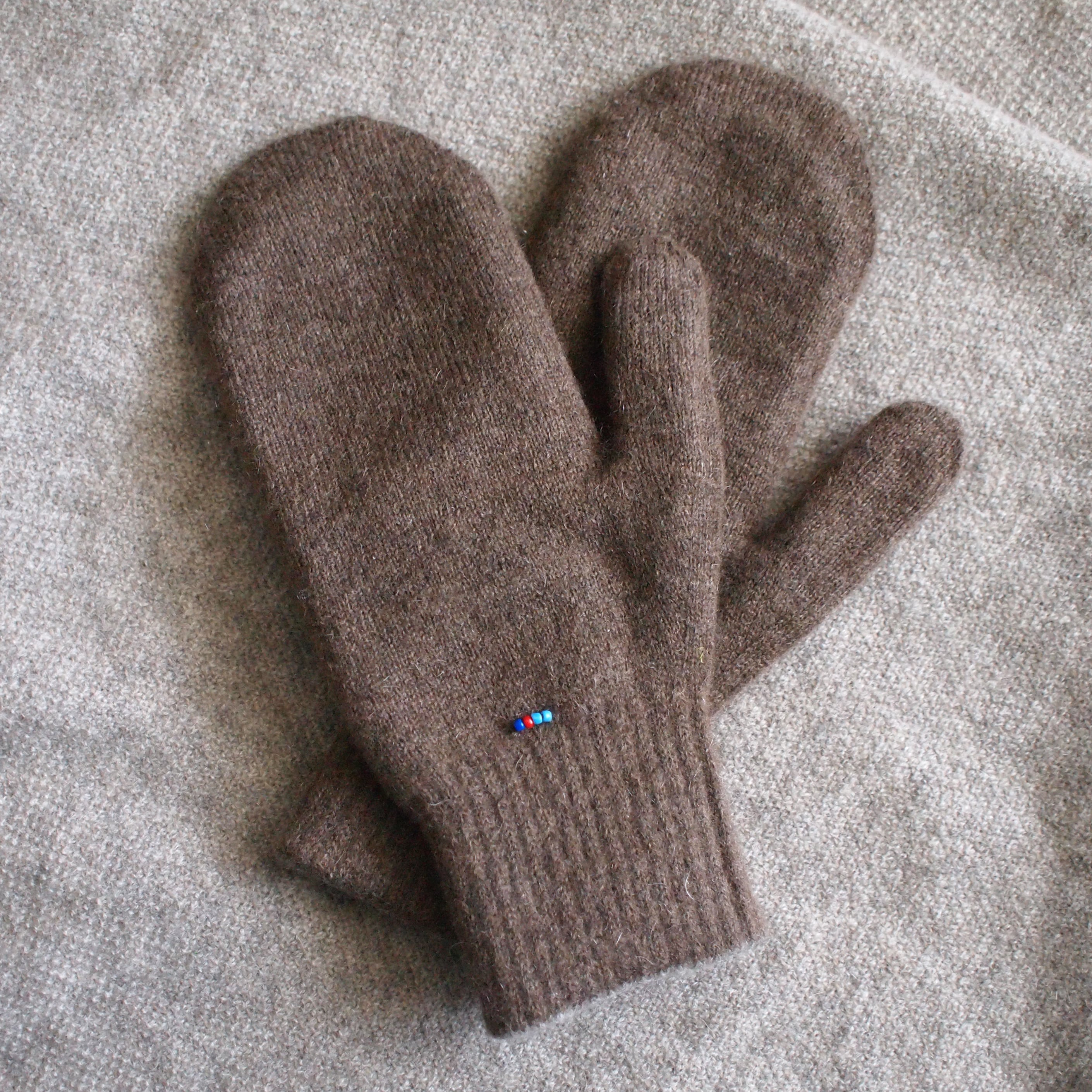 <2枚重ねが暖かい>コロンとした丸みのあるフォルムが愛らしいミトン。接ぎ合わせのない立体的なホールガーメントで編み上げているから、肌あたりの優しい付け心地です。完全に2重にした作りは、抜群の暖かさ。内側の配色が、ちらりと見えておしゃれなアクセントです。