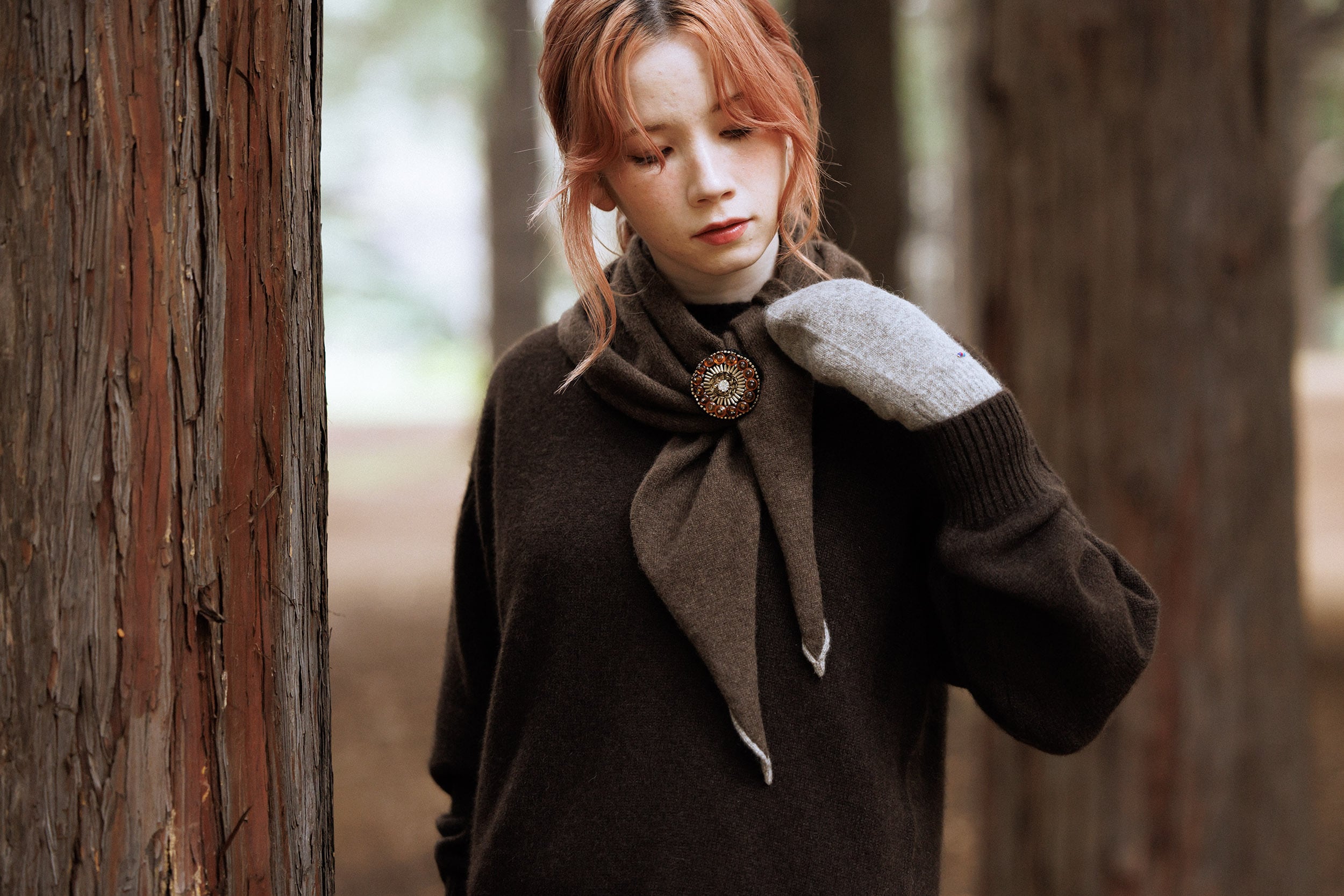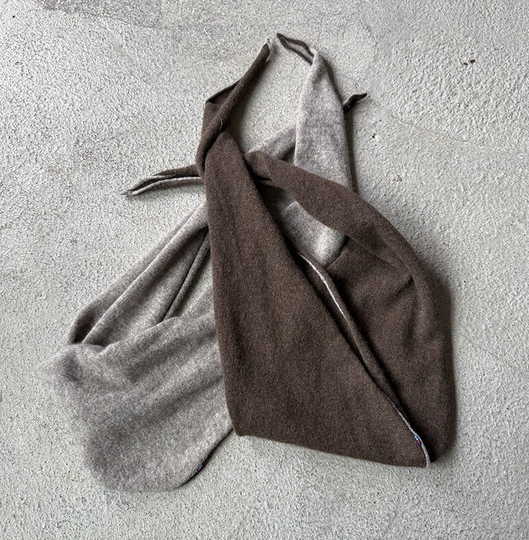 ひし形のニットスカーフは、首元にフィットする使いやすいサイズ感が魅力。柔らかく編んだ天竺編みの周りには、配色をぐるりと取り巻いてアクセントにしています。ひと結びして前に垂らしたり、後ろで交差させたり、アレンジ自在のデザインです。
