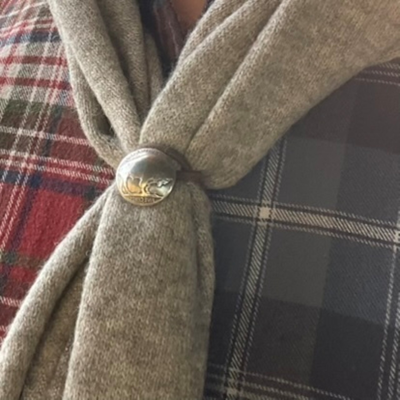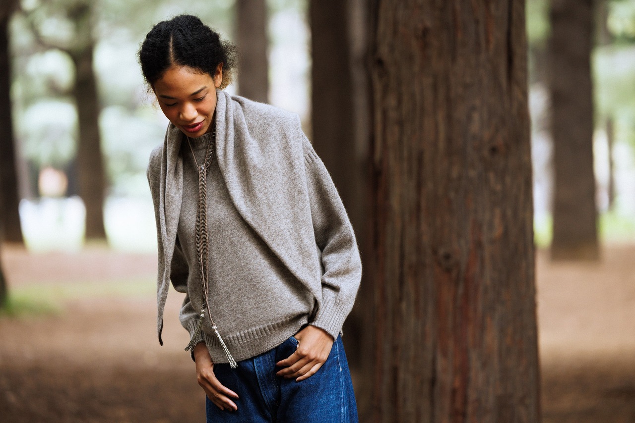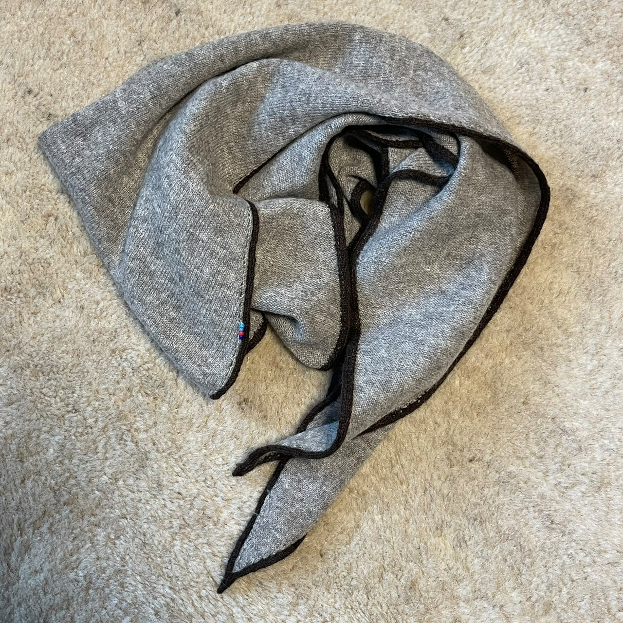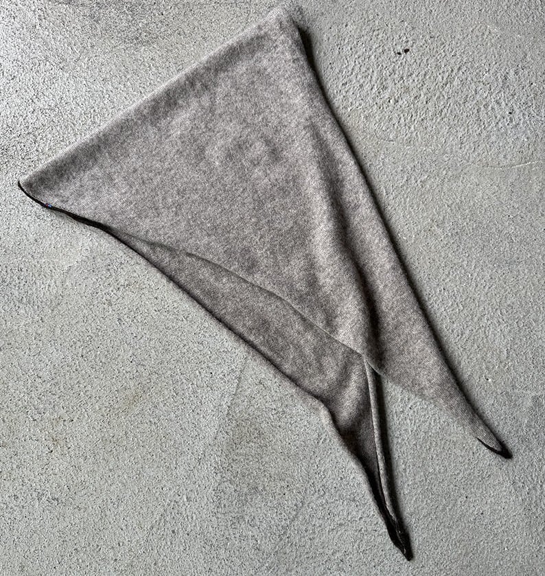 ひし形のニットスカーフは、首元にフィットする使いやすいサイズ感が魅力。柔らかく編んだ天竺編みの周りには、配色をぐるりと取り巻いてアクセントにしています。ひと結びして前に垂らしたり、後ろで交差させたり、アレンジ自在のデザインです。