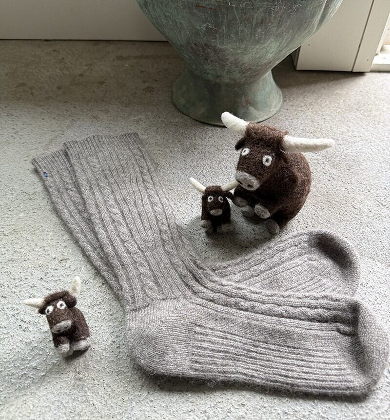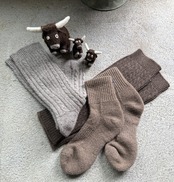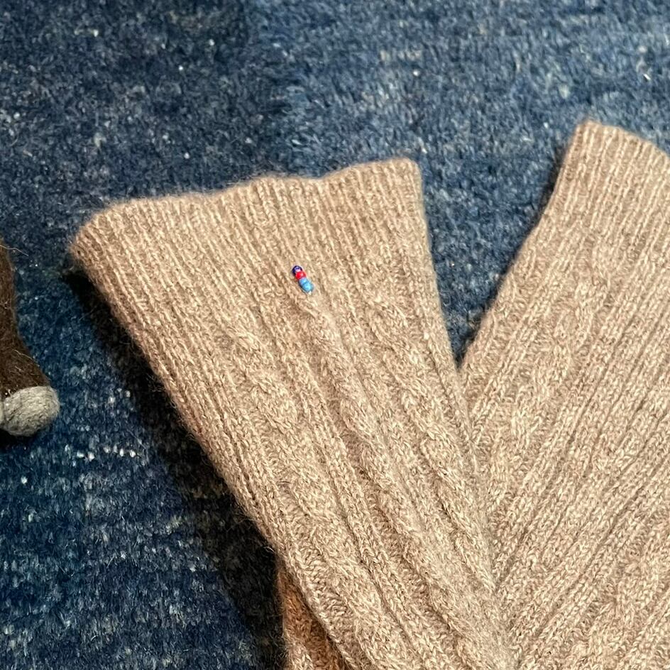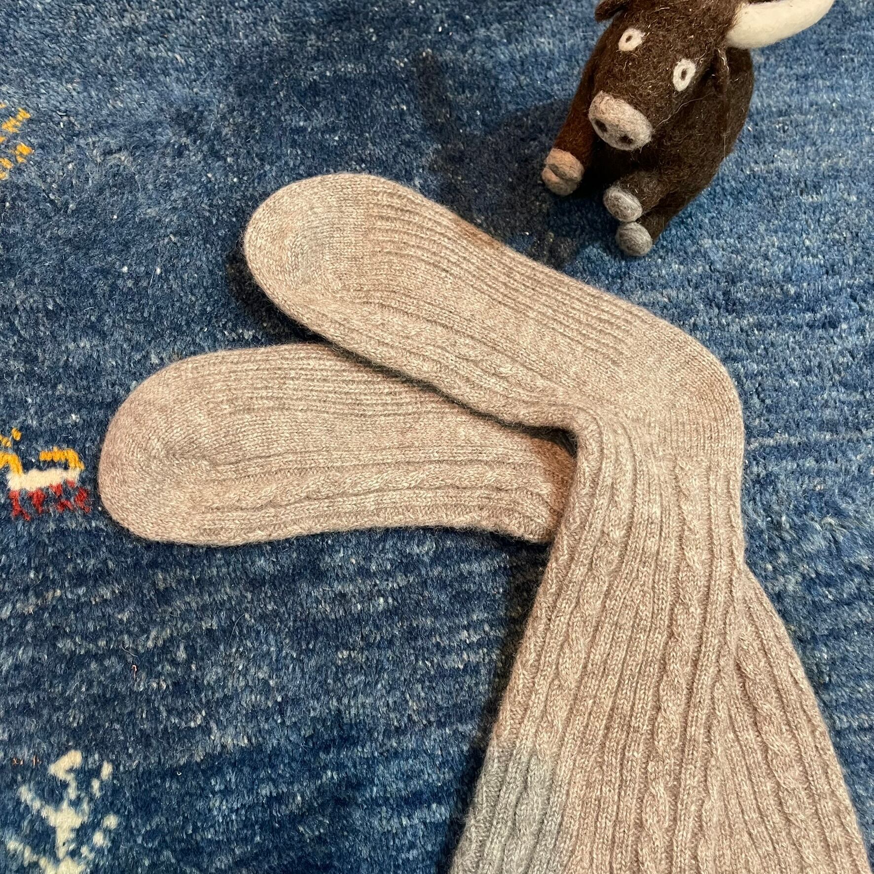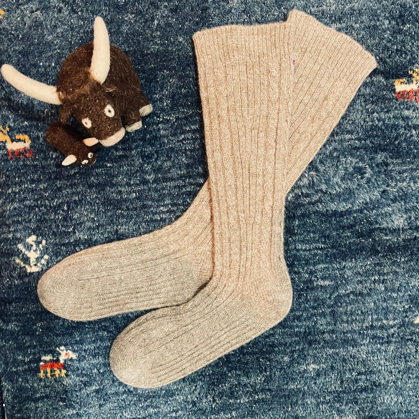 ナチュラルなグレージュカラーの長め丈のルームソックスは、ケーブル編みが素朴なYAKの風合いに絶妙にマッチしています。しめつけ感のない立体的なホールガーメント編みで、ひざ下丈をゆるっと履くのがオススメ。レギンスなどの裾をインしてもおしゃれです。