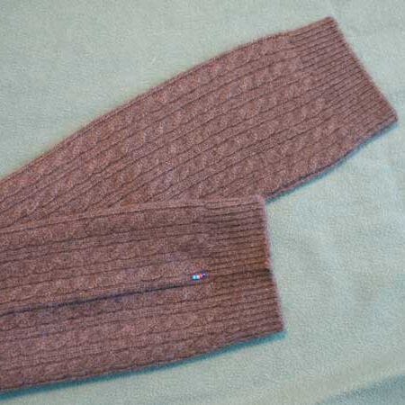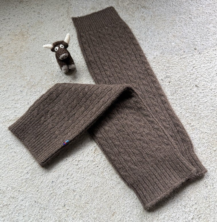 温かみのあるこっくりとした色合いが魅力の、無染色ブラウンのレッグウォーマー。細めのケーブル編みとリブのコンビネーションは、ひざ下をすっきり見せつつ、立体的な編み柄で暖かさもひとしお。室内はもちろん、パンツやロングスカートの足元に忍ばせても。