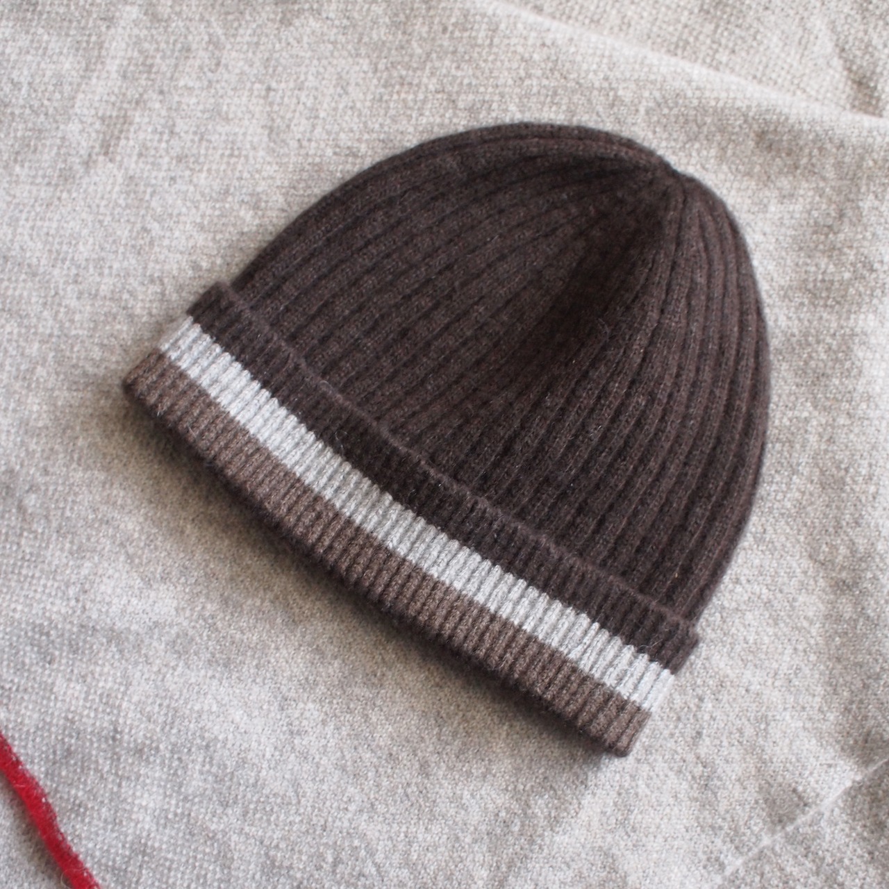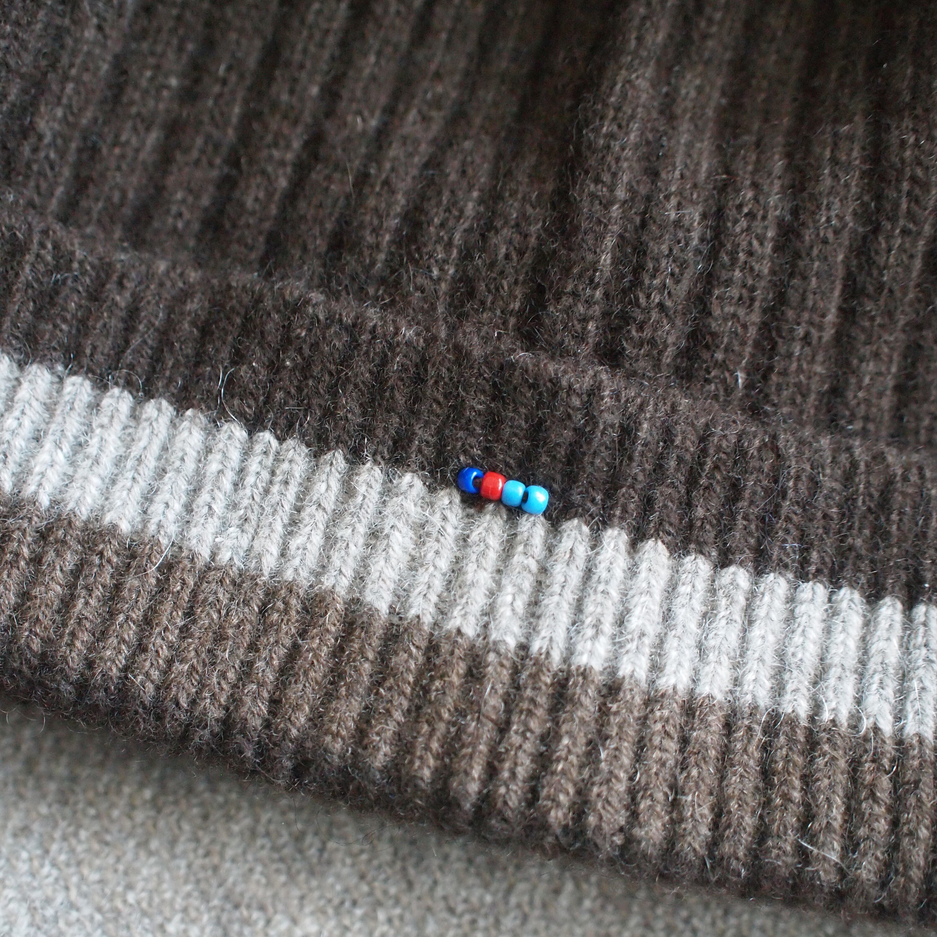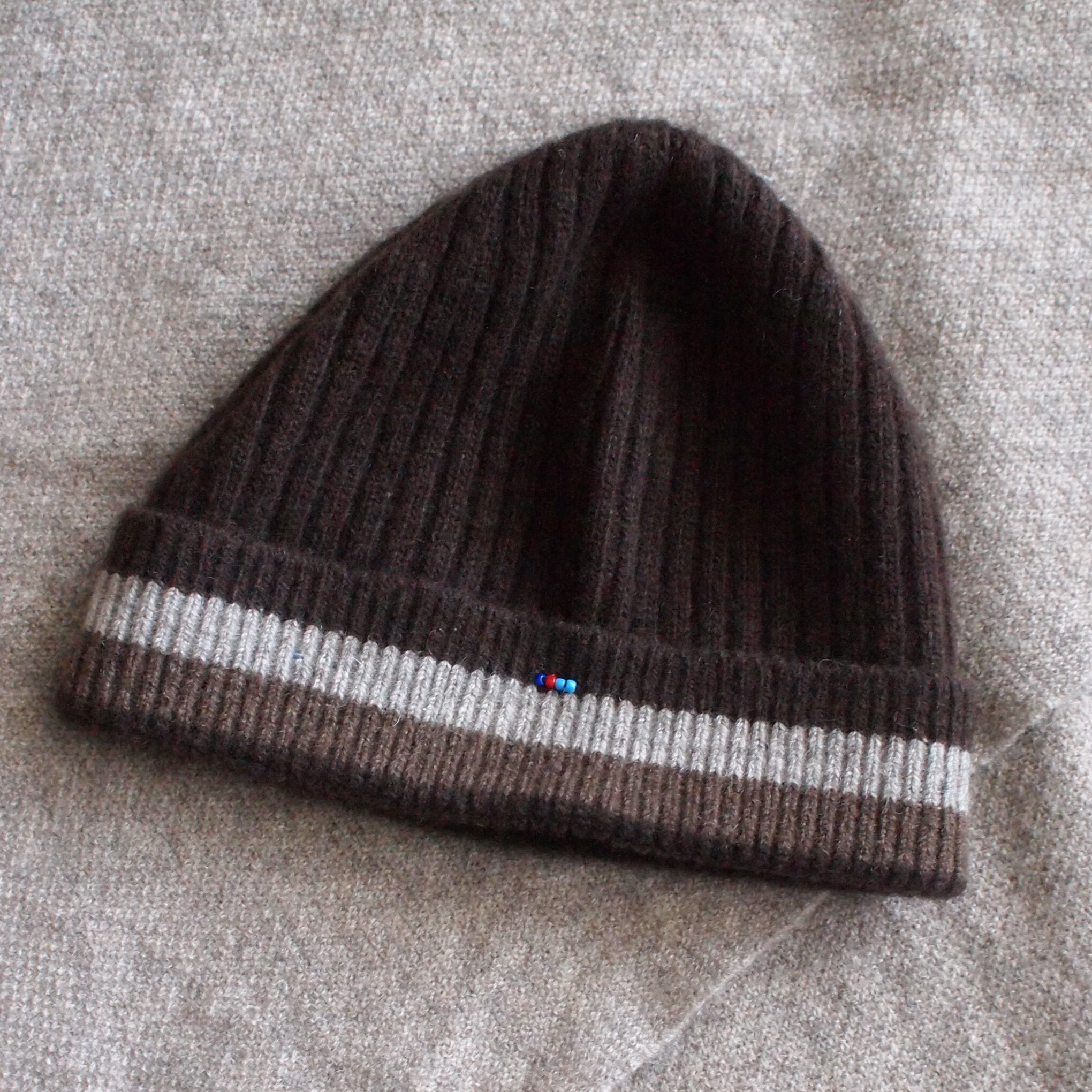 ホールガーメント機で丸~く筒状に編まれたニットキャップは、縫い代のない心地よいフィット感がポイント。髪色になじむダークブラウンに、グレージュとブラウンのラインでボーダーを配してスポーティー&レトロなアクセントに。ユニセックスでお使いいただけるデザインです。