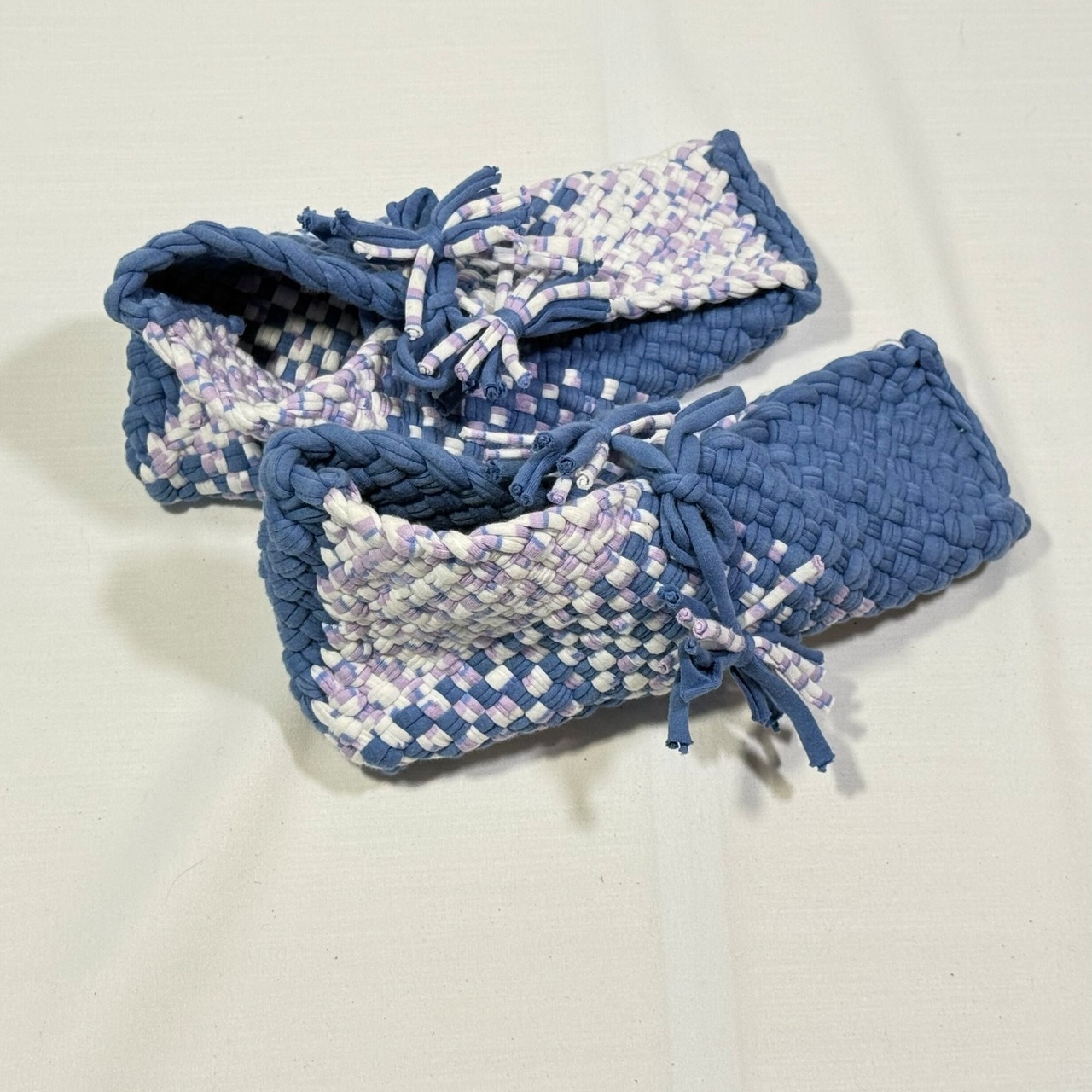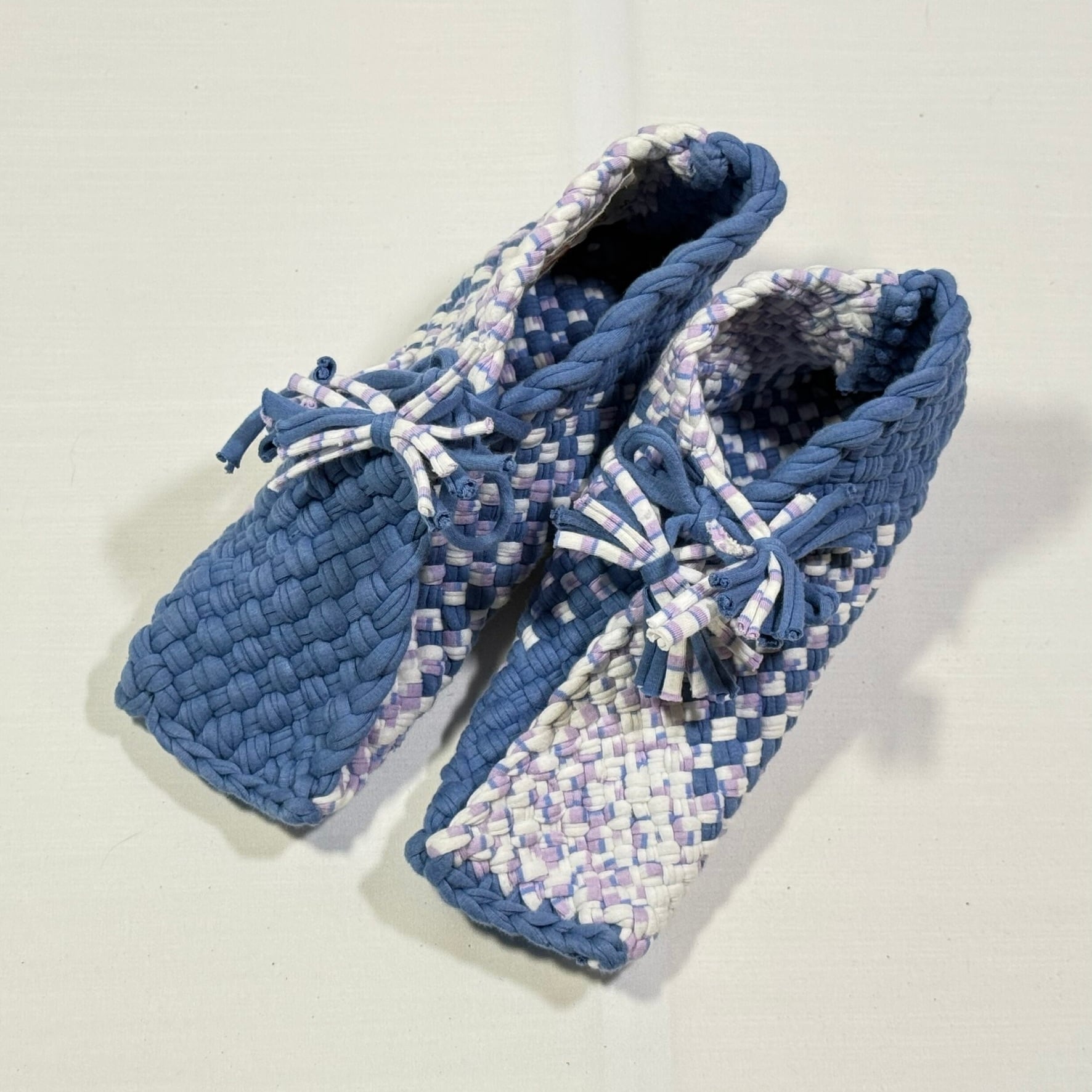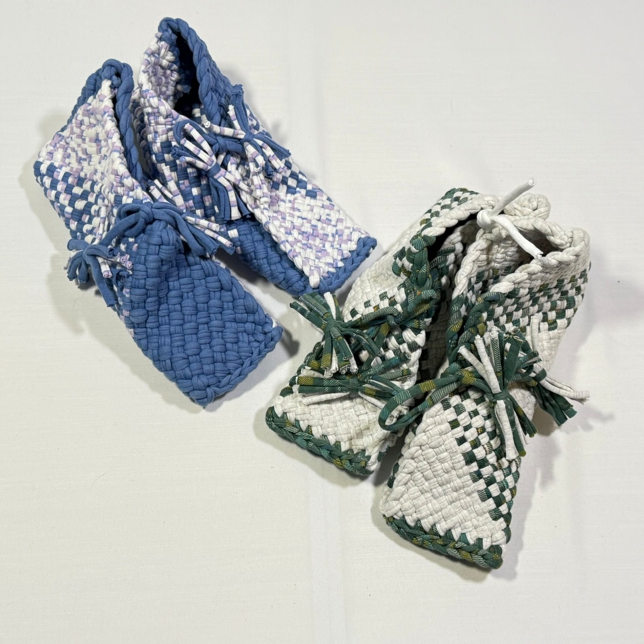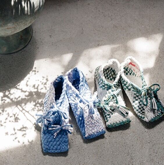 復刻させたインド古来の木製機で編み込まれた平らな四角い生地を、つま先とかかとの2か所だけ接ぎ合わせたシンプルでユニークなデザイン。綿のTシャツの端材を使っているから素足に気持ち良く、伸びやかで履くほどに足になじみます。タッセル風リボンがアクセント、「PROJECT1000」オリジナルの保存袋に入れてお届けします。