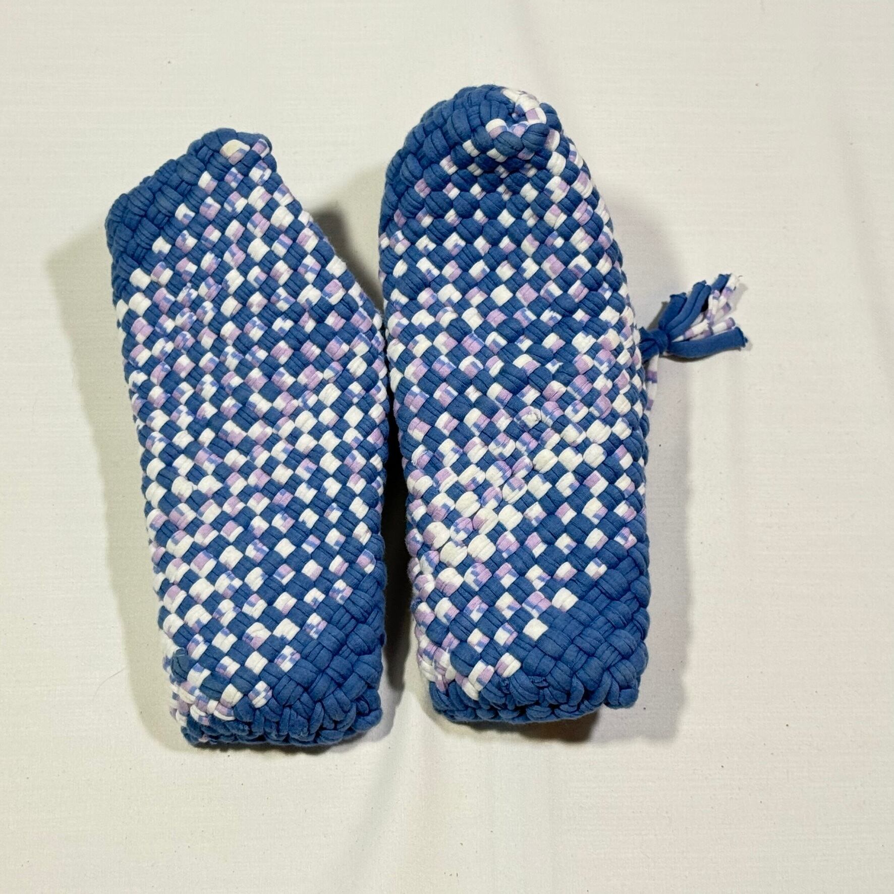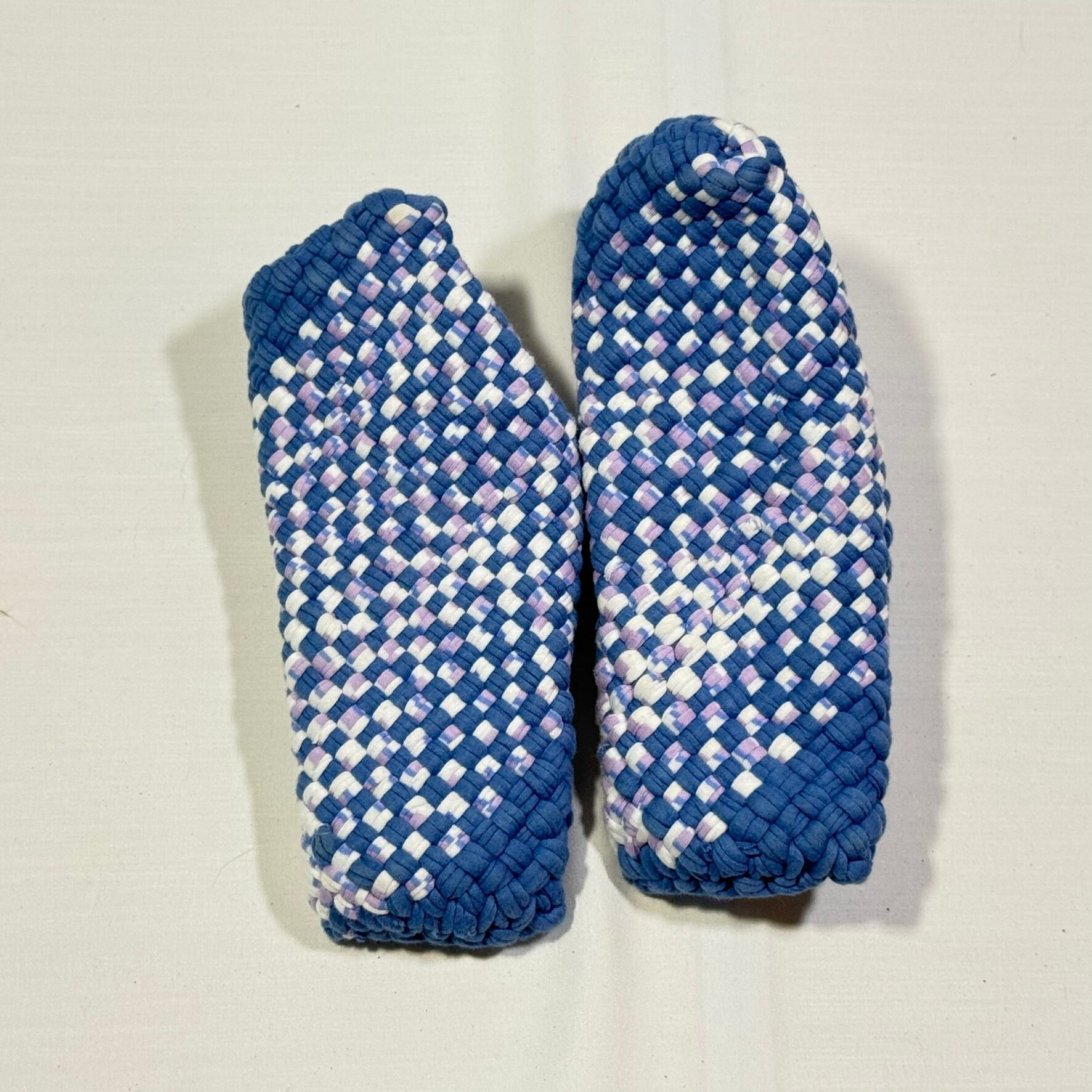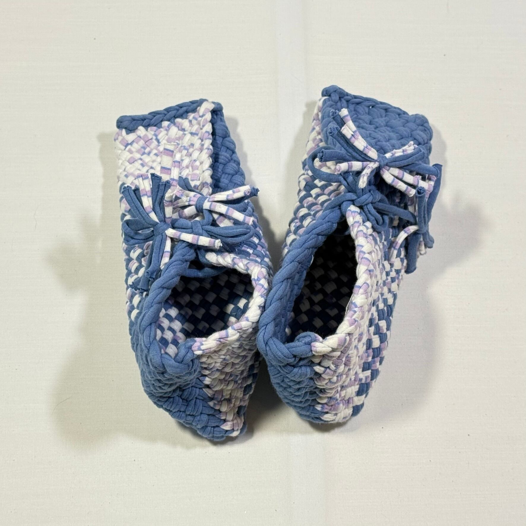 復刻させたインド古来の木製機で編み込まれた平らな四角い生地を、つま先とかかとの2か所だけ接ぎ合わせたシンプルでユニークなデザイン。綿のTシャツの端材を使っているから素足に気持ち良く、伸びやかで履くほどに足になじみます。タッセル風リボンがアクセント、「PROJECT1000」オリジナルの保存袋に入れてお届けします。