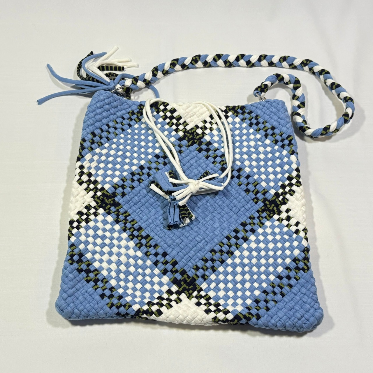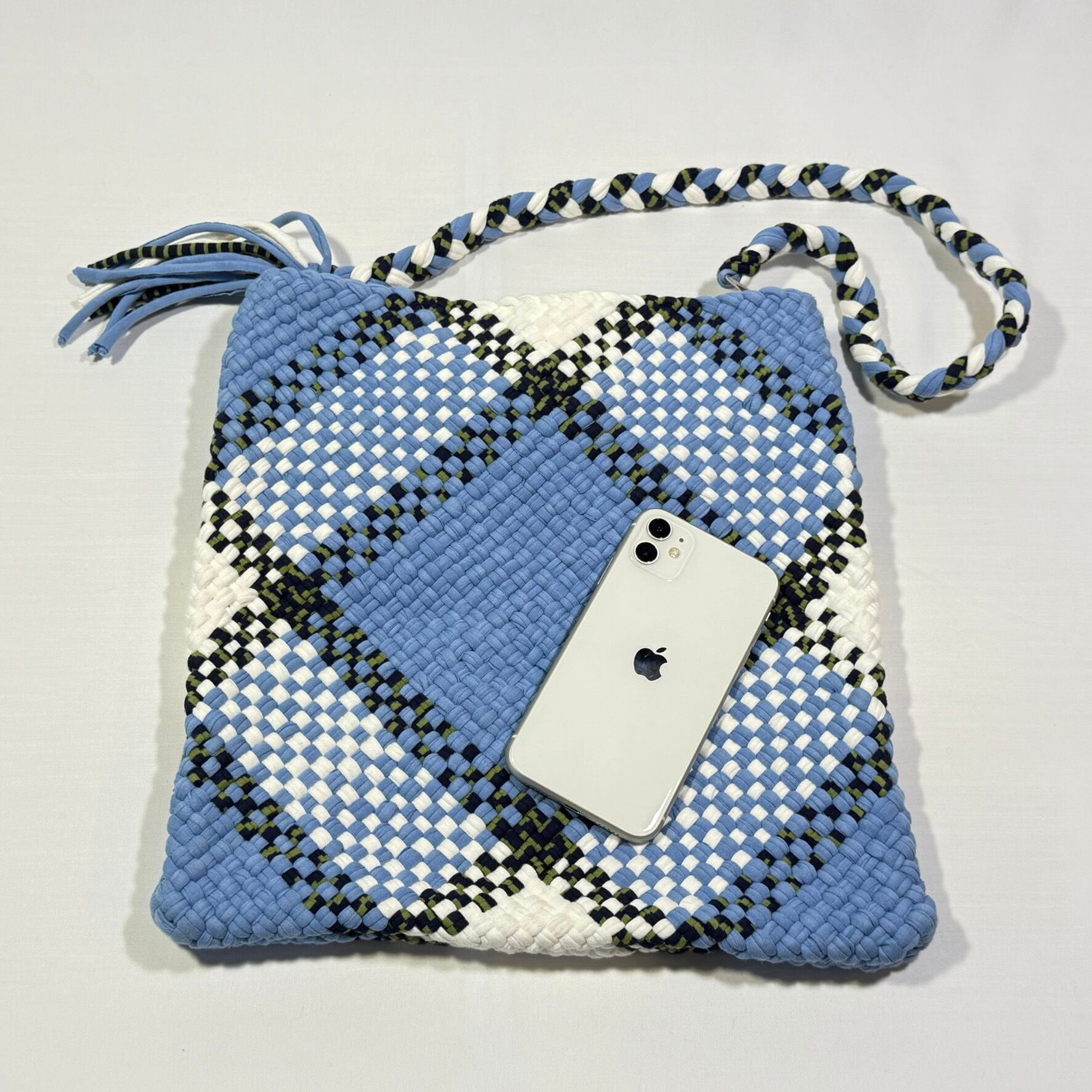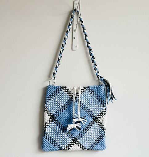 大胆な格子柄のショルダーバッグは、体になじむフィット感が使いやすく A4サイズがしっかり入る便利なサイズ。平編みで表現した大き目の格子柄に、ショルダーの三つ編みとタッセル、シルバーカラーのリングがアクセントです。「PROJECT1000」オリジナルの保存袋に入れてお届けします。