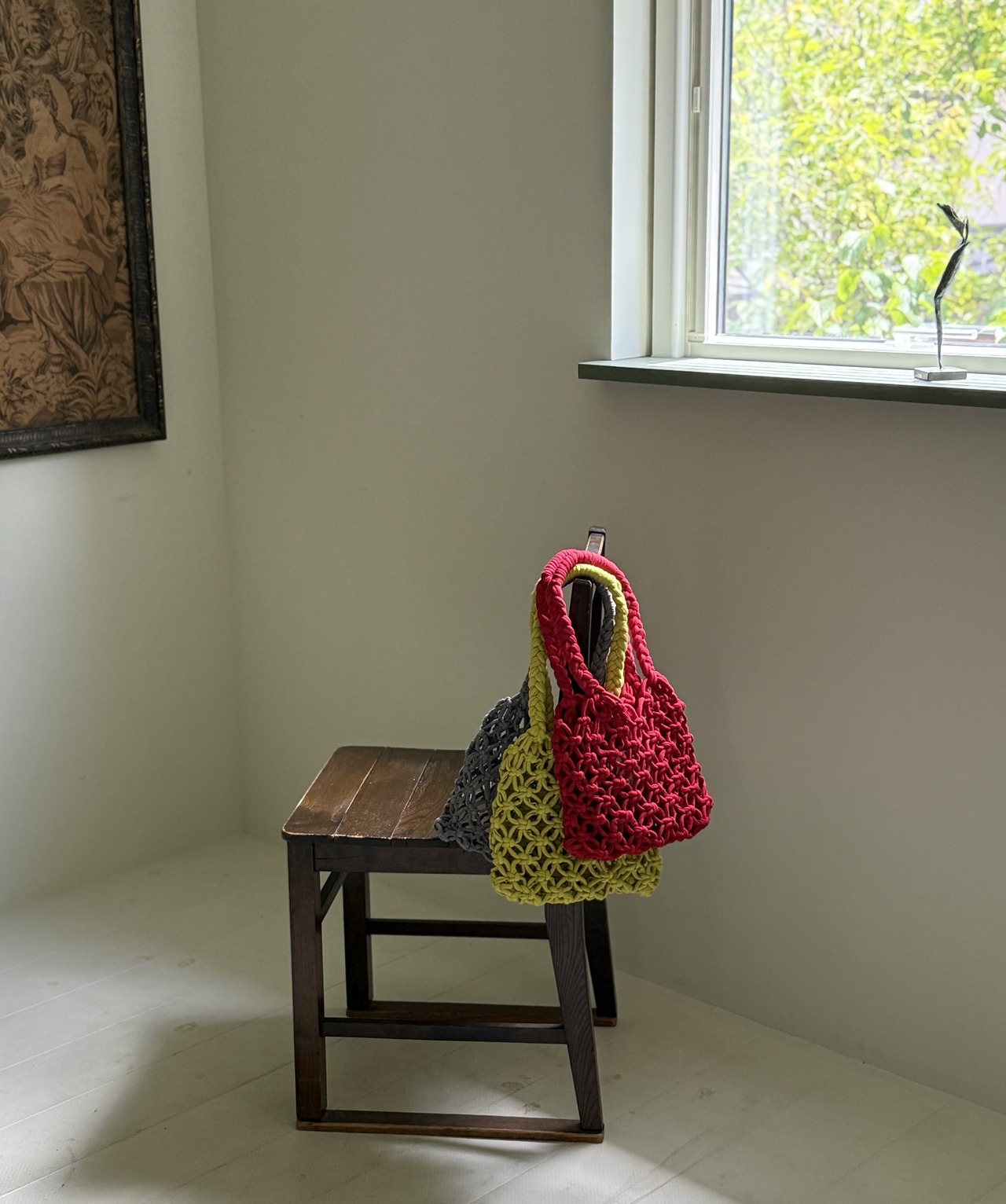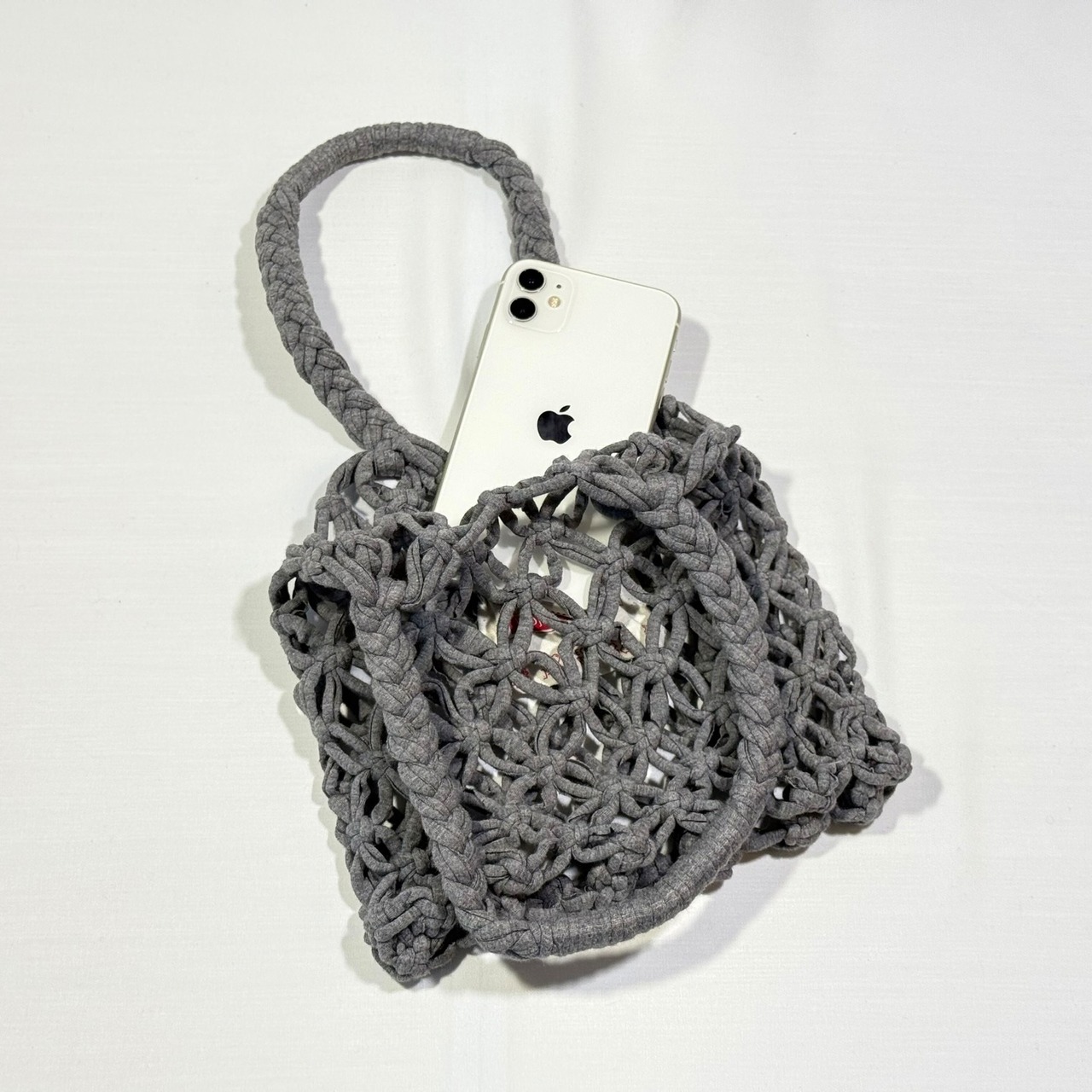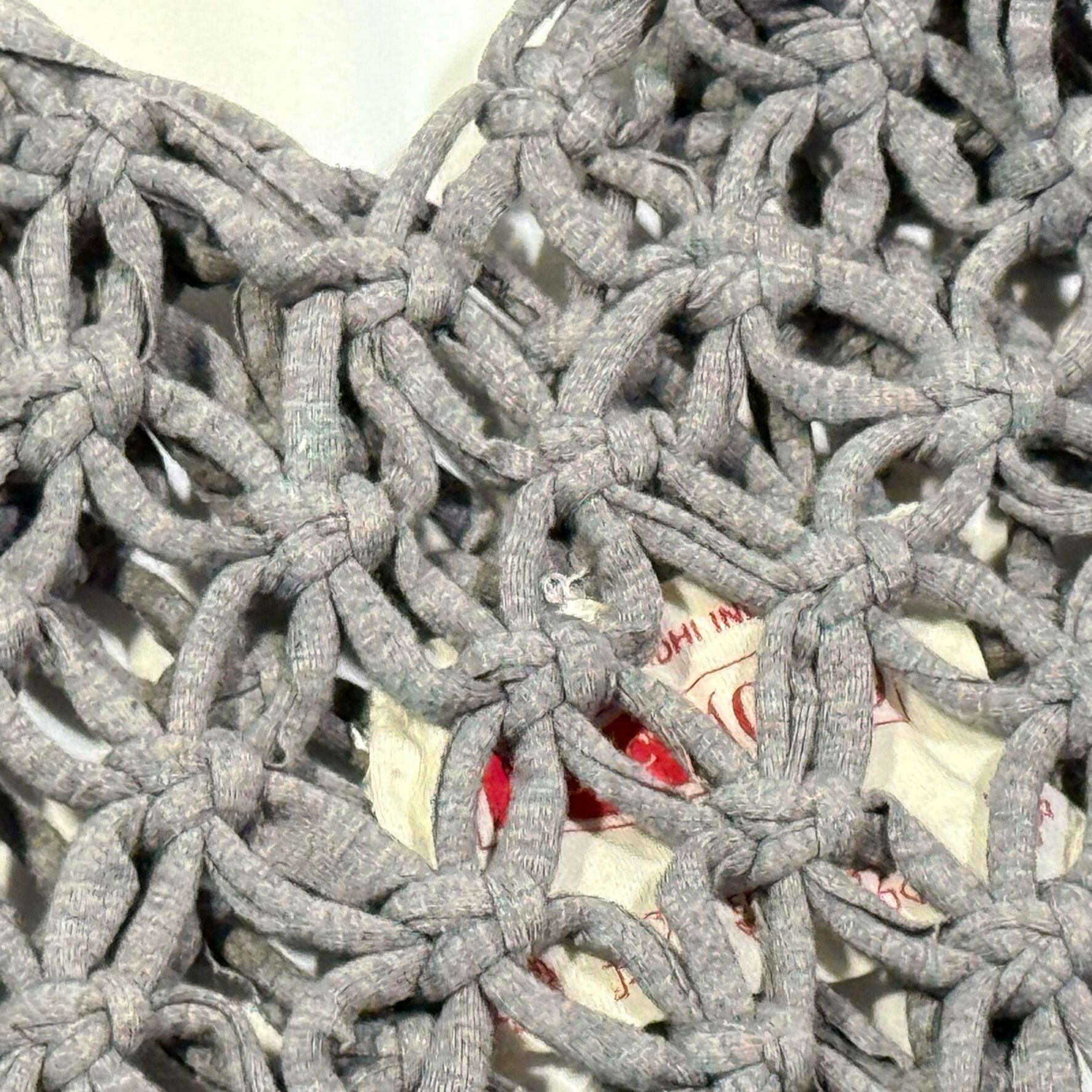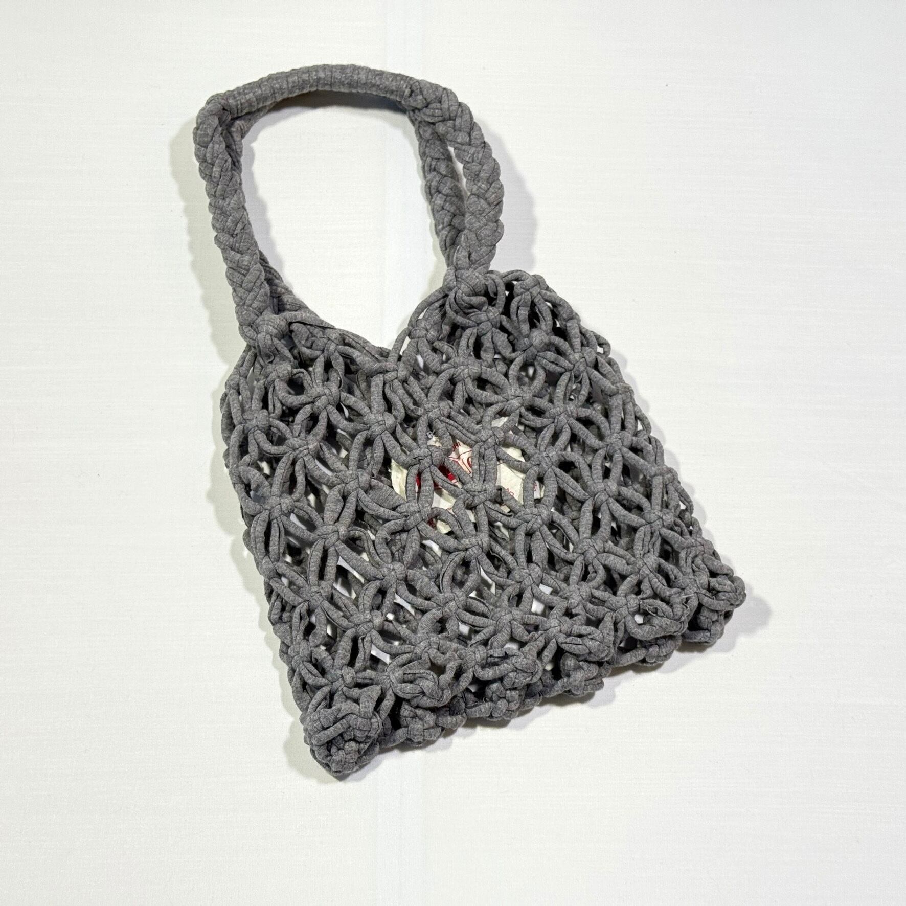 「マクラメ編み」の結び目の周りを、花びらのようなネット状に間隔を空けて軽やかに編まれたミニバッグ。身の回りの物を入れるのに、ちょうど良いサイズ感です。Tシャツの端材を再利用しているから、柔らかくて伸び伸びする感触が独特な使い心地。旅行のお供や、浴衣などにも好相性です。ネット編みのすき間が空いているので、内袋をお使いください。